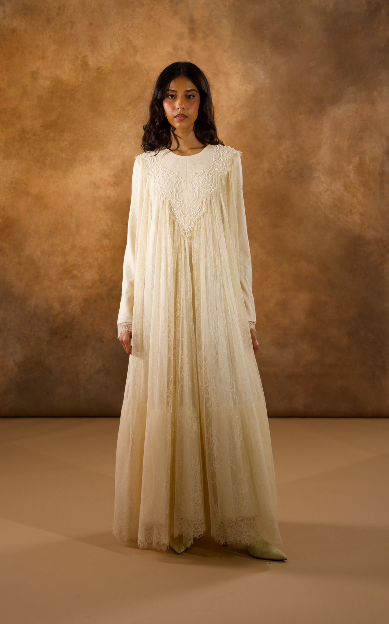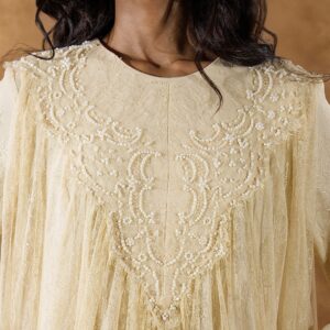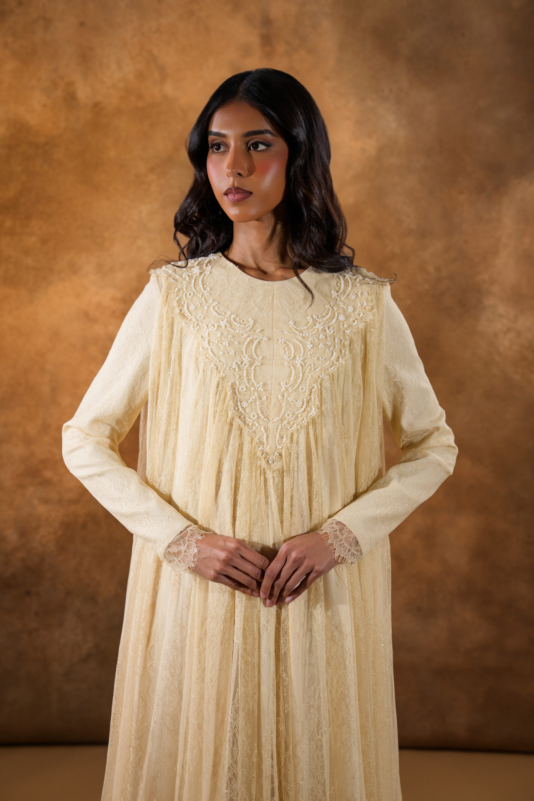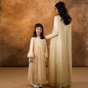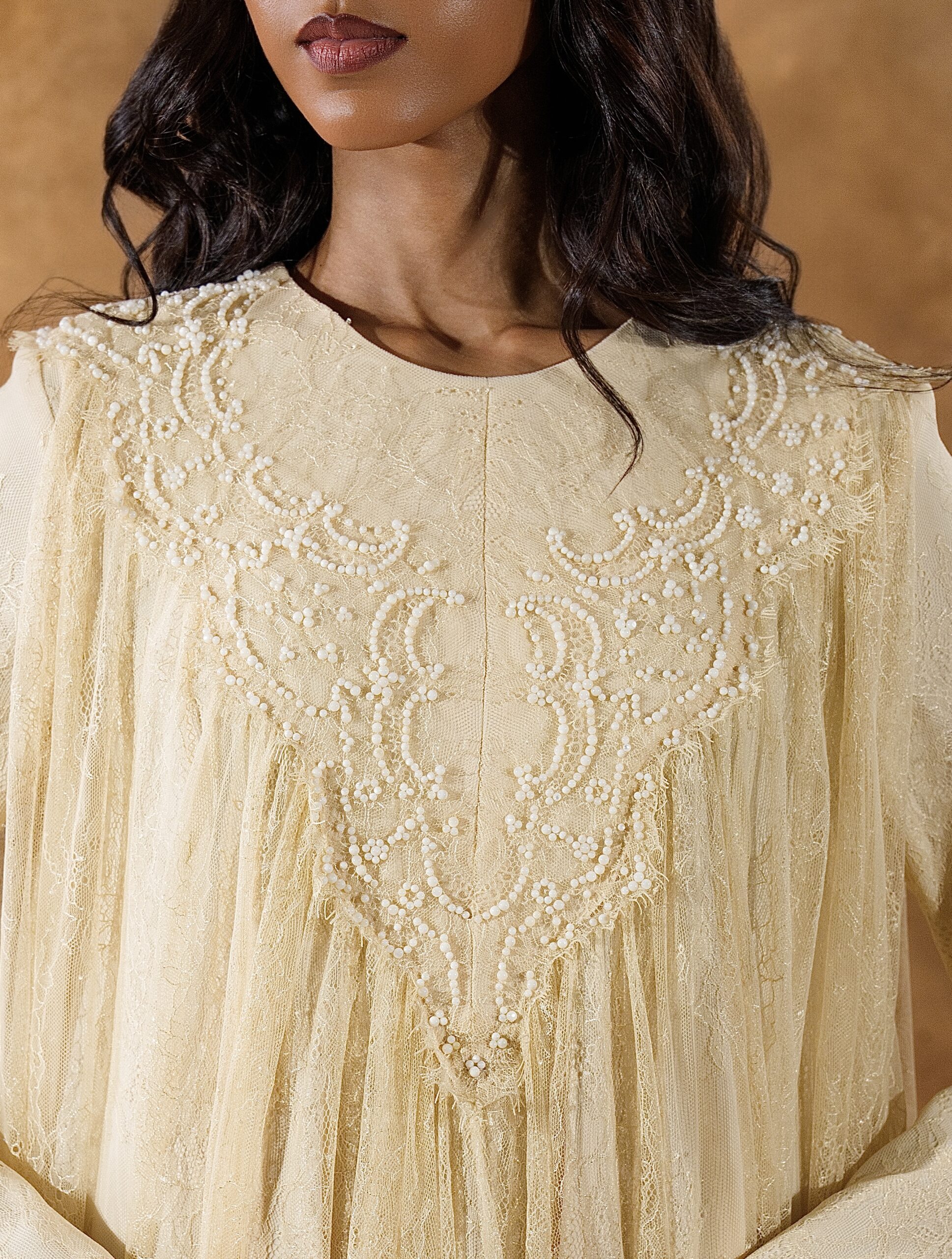 فستان من دانتيل شانتيي الفرنسي بالكامل، مزخرف بتطريزات خرز فاخرة على الياقة الأمامية ليمنح إطلالة راقية وأنثوية ناعمة. يتميز بطبقة إضافية من التول أسفل الفستان لتعزيز الحجم والانسيابية، مما يضفي حركة جميلة وأناقة فاخرة في كل خطوة.