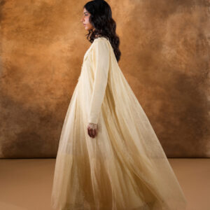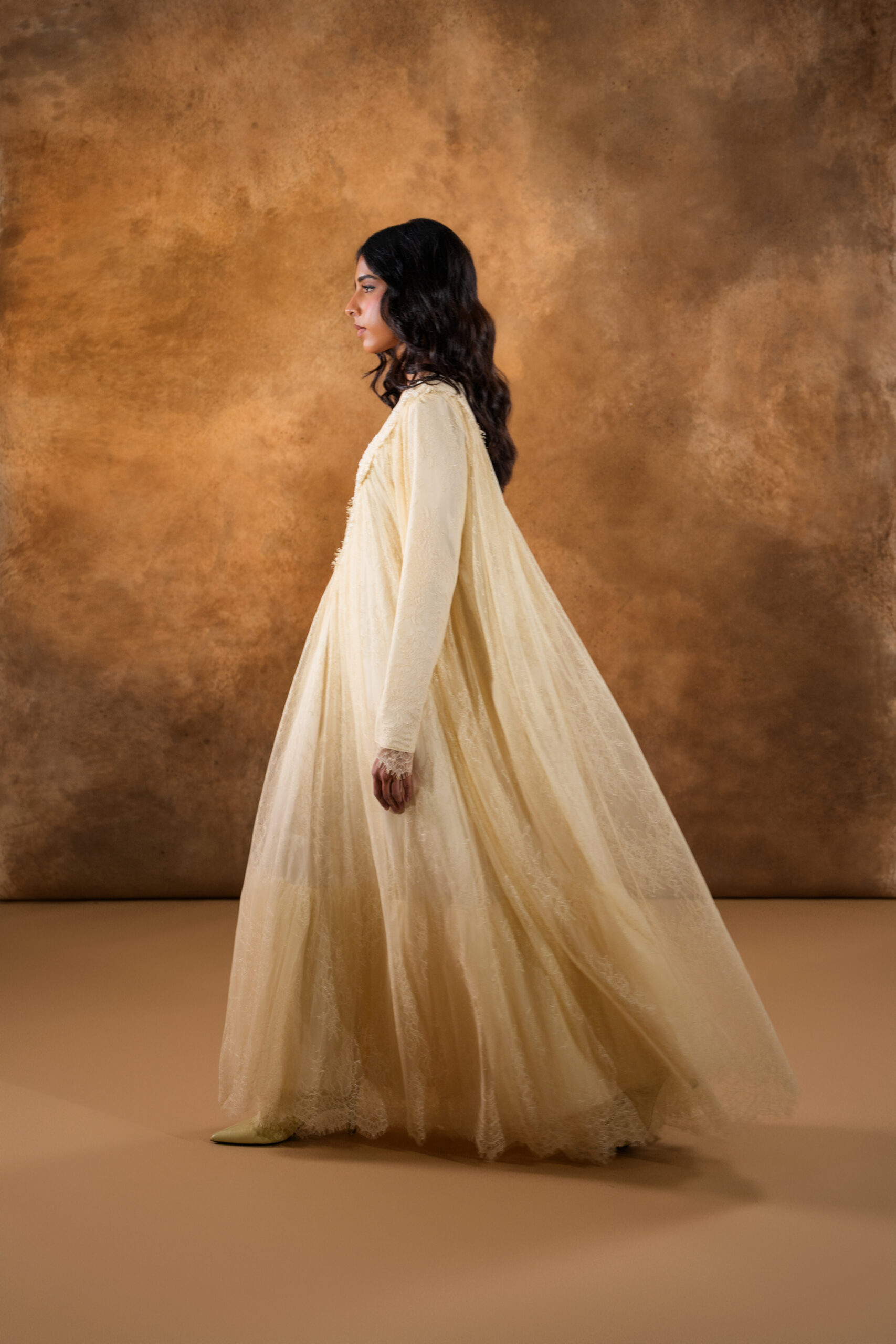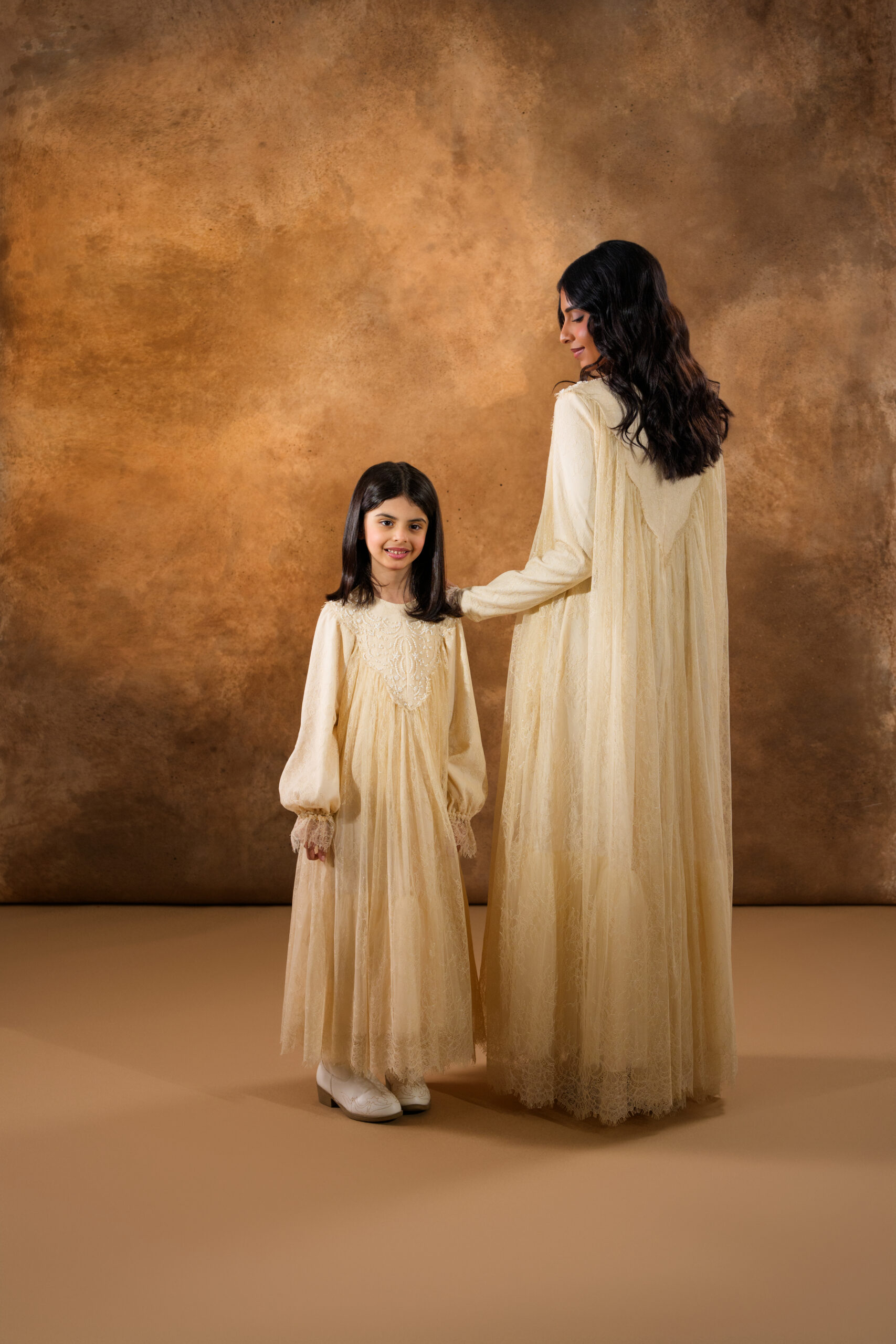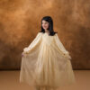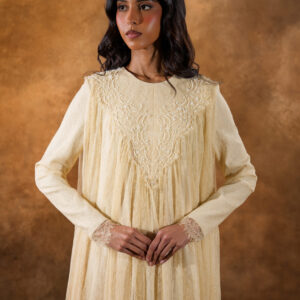 فستان من دانتيل شانتيي الفرنسي بالكامل، مزخرف بتطريزات خرز فاخرة على الياقة الأمامية ليمنح إطلالة راقية وأنثوية ناعمة. يتميز بطبقة إضافية من التول أسفل الفستان لتعزيز الحجم والانسيابية، مما يضفي حركة جميلة وأناقة فاخرة في كل خطوة.