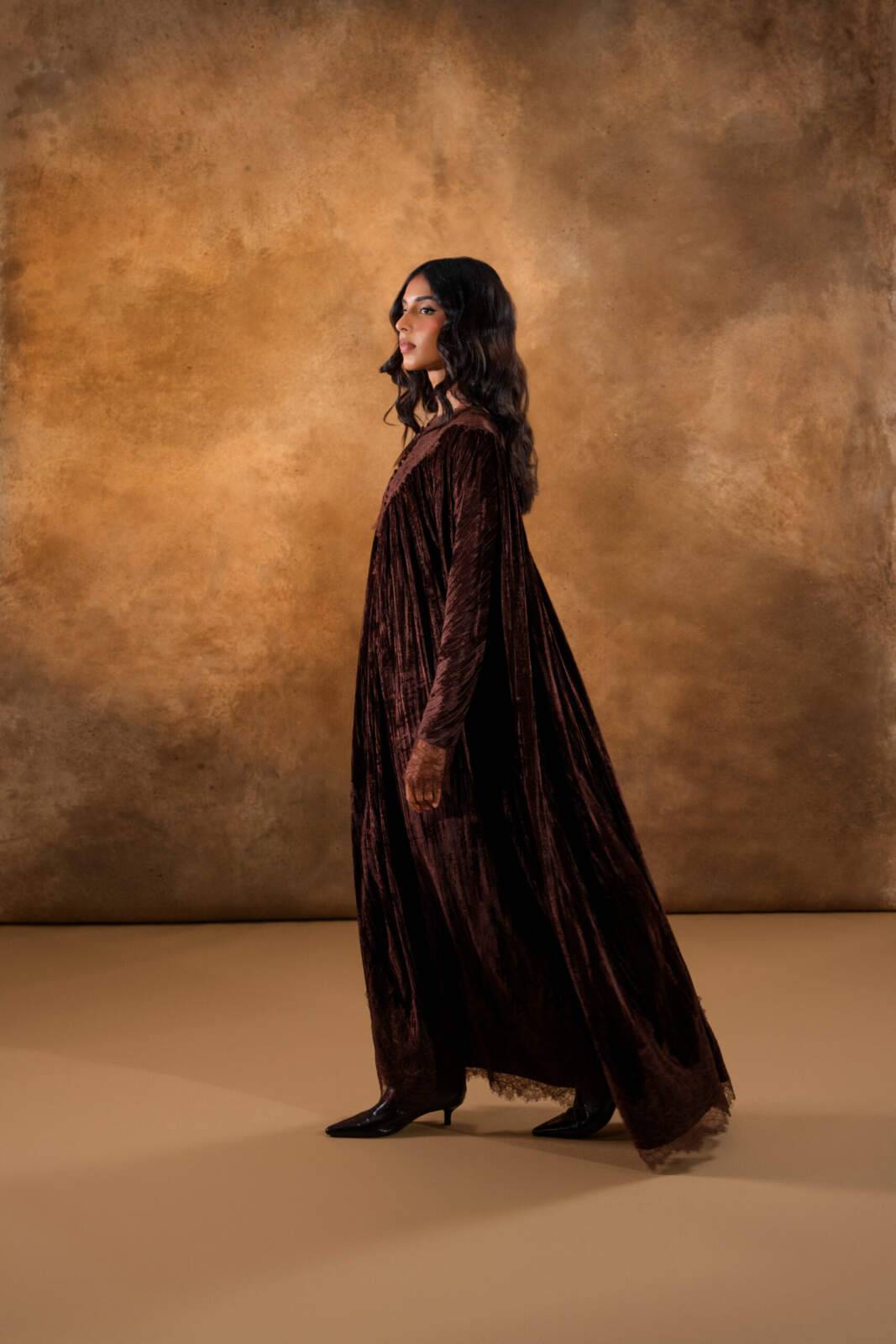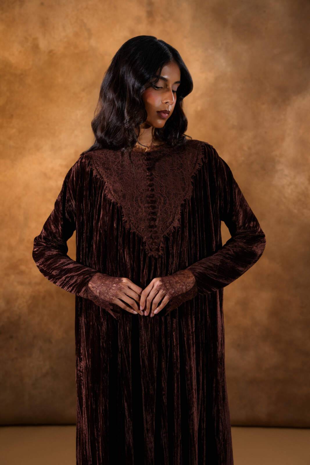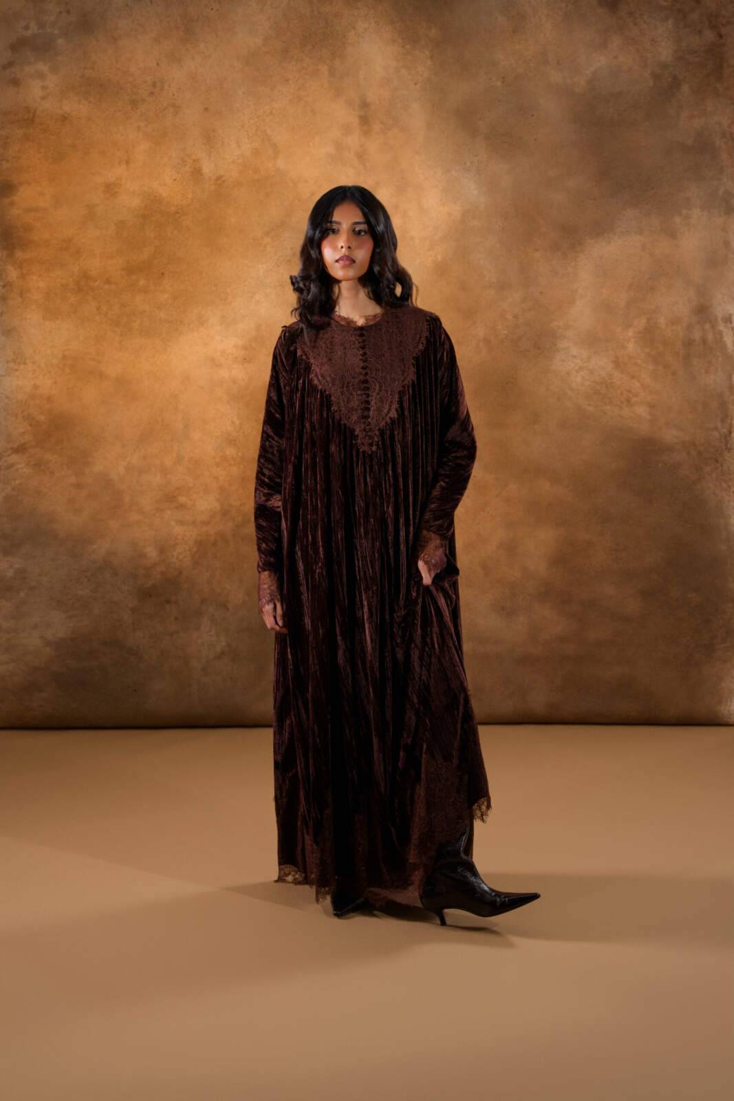 فستان بلون البني إسبريسو مصنوع من مخمل فاخر بتفاصيل ياقة دانتيل فخمة وتطريزات ناعمة على الأكمام تضفي لمسة رقي وأناقة. يأتي بقصة منسدلة وانسيابية مع لمعة مخملية subtile تمنح إطلالة راقية وناعمة.