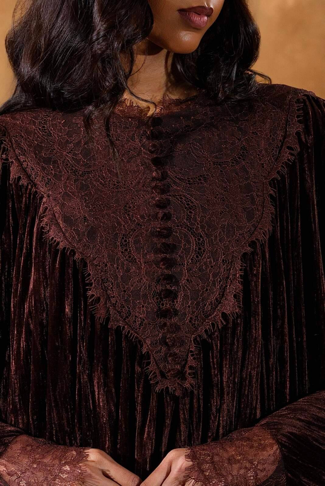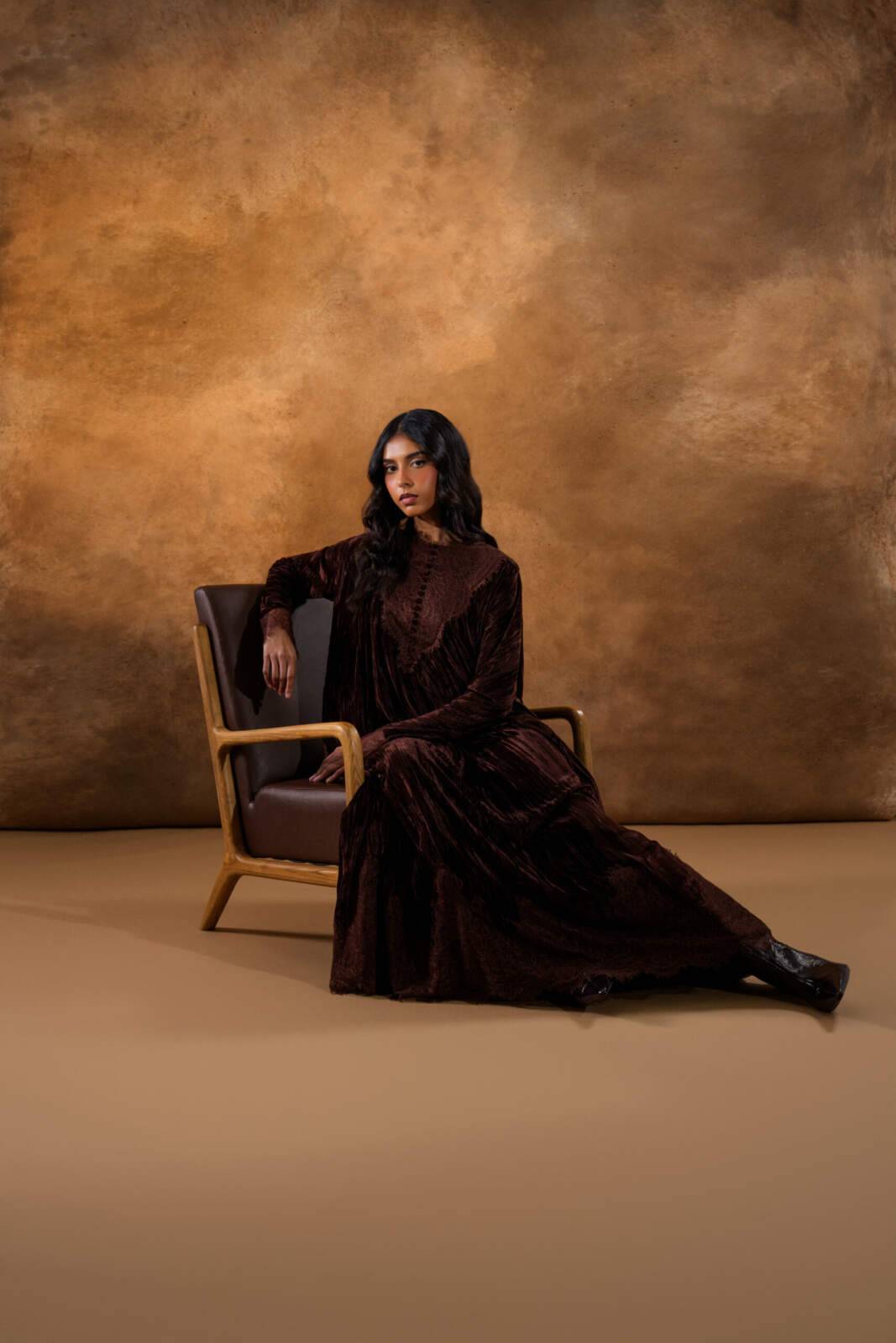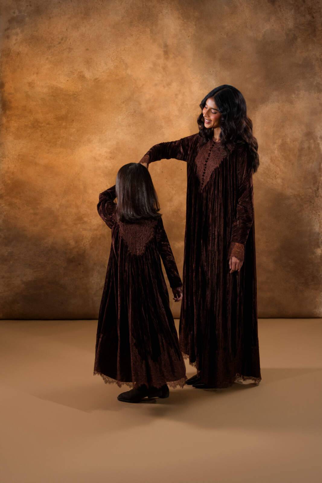 فستان بلون البني إسبريسو مصنوع من مخمل فاخر بتفاصيل ياقة دانتيل فخمة وتطريزات ناعمة على الأكمام تضفي لمسة رقي وأناقة. يأتي بقصة منسدلة وانسيابية مع لمعة مخملية subtile تمنح إطلالة راقية وناعمة.
