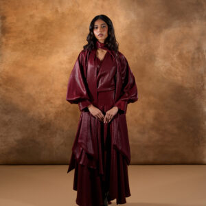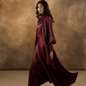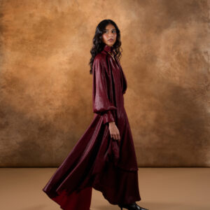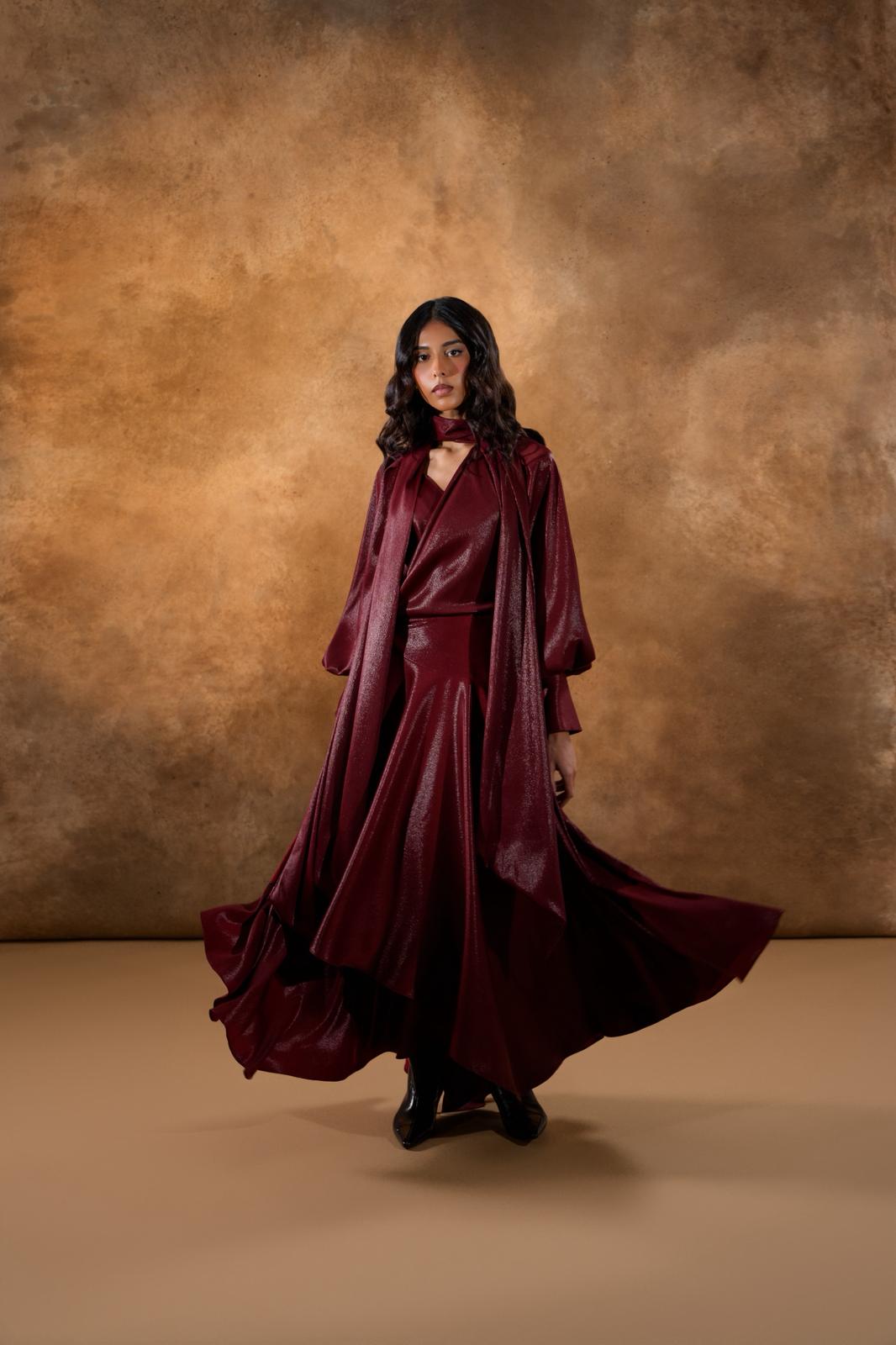 فستان بلون جارنيت غني مصنوع من قماش لامع بنعومة ينساب بانسيابية أنيقة مع الحركة. يتميز بتصميم صدر ملفوف، وأكمام واسعة، وتنورة متسعة تضفي أناقة راقية وقصّة أنثوية معاصرة، مثالي للمناسبات المسائية والإطلالات الخاصة.