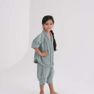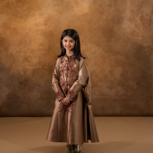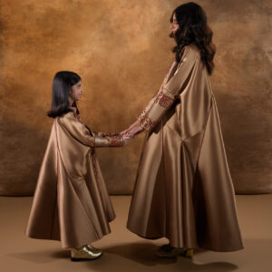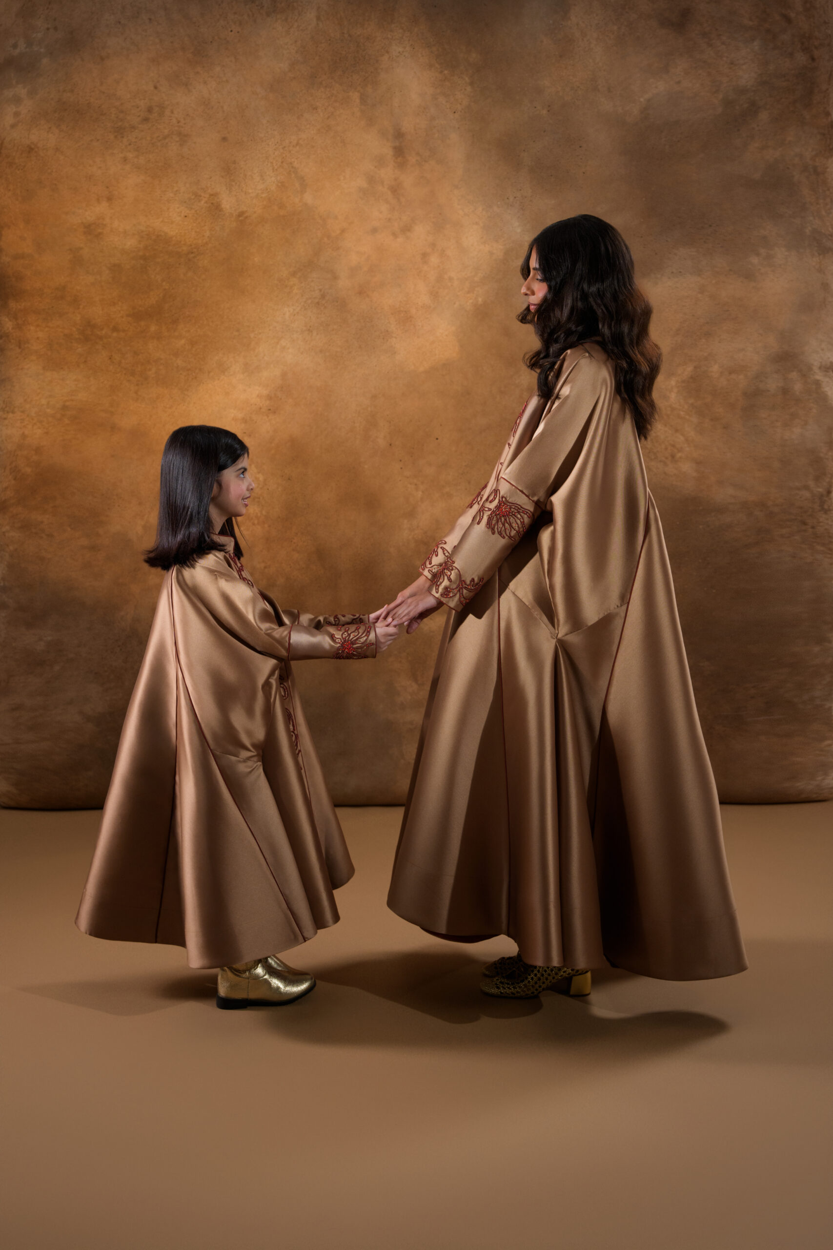 كاڤتان من قماش ميكادو بلون كاراميل بتطريز فاخر وتزيين ناعم يُبرز جمال القصّة الانسيابية. يأتي بتفاصيل بايبينغ دقيقة وقصّة مريحة وواسعة تمنح الصغيرة أناقة رقيقة وحضورًا راقيًا.