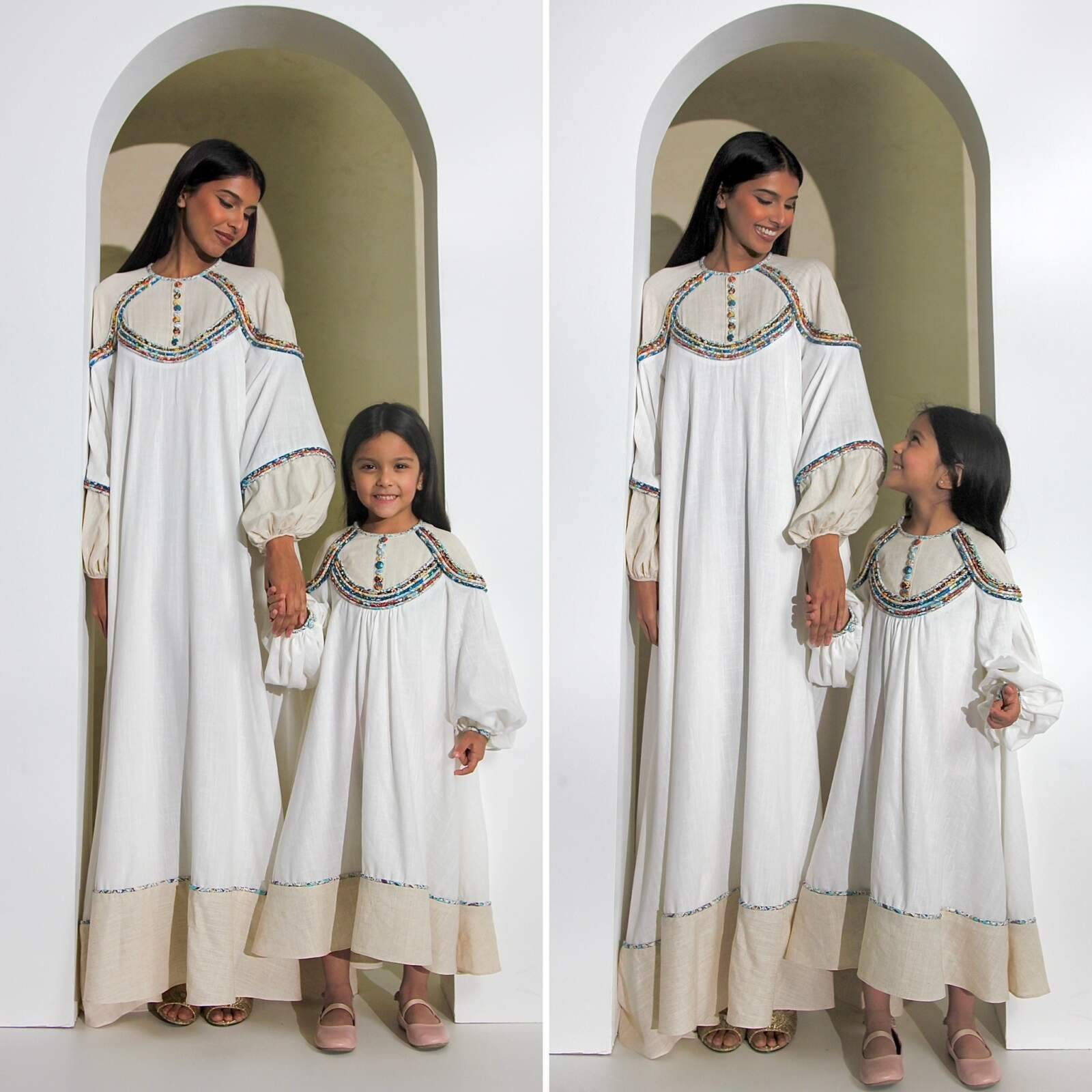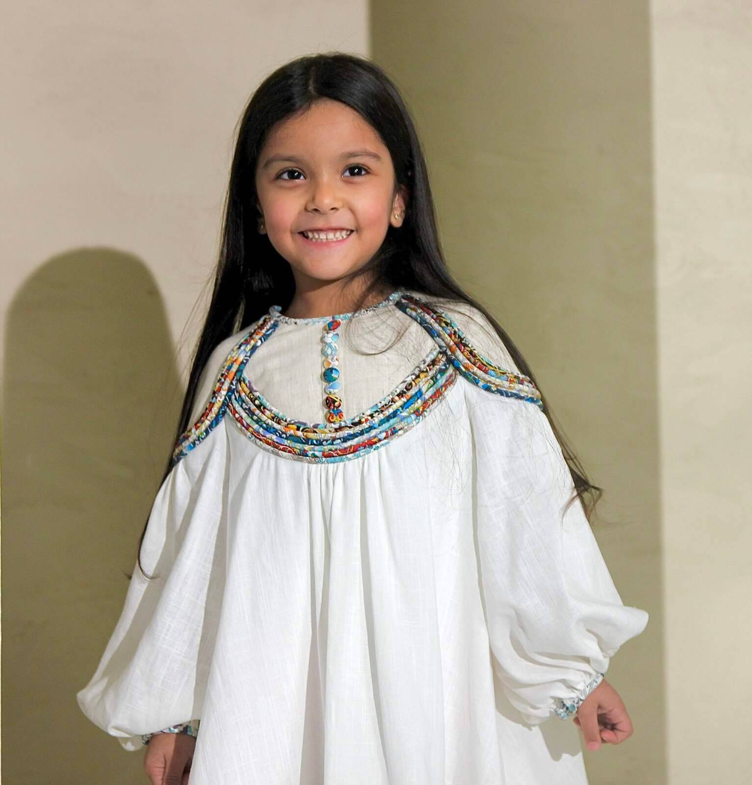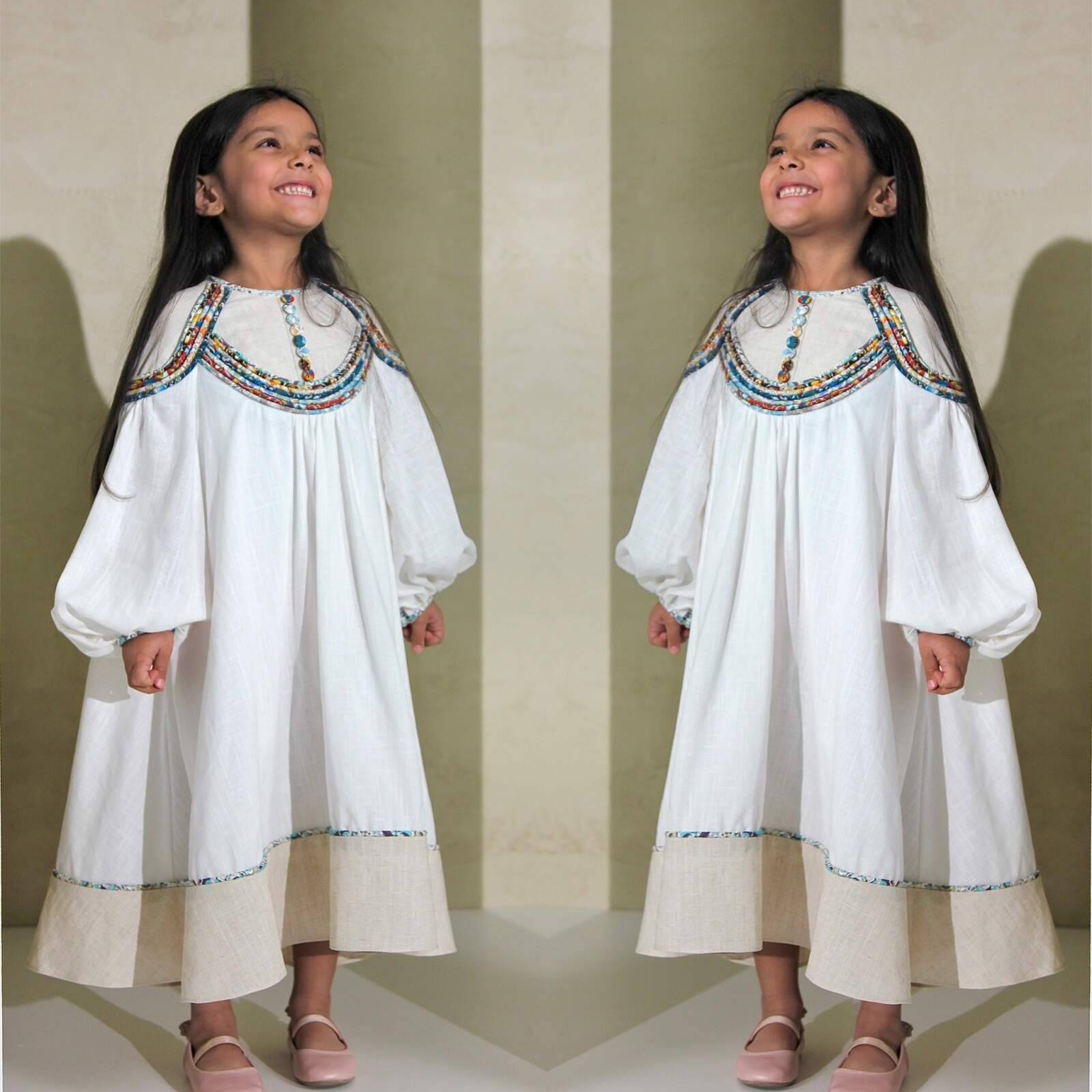 فستان من اللينن المخلوط مزين باحبال من اقمشة مشجرة مختلفة. الفستان مبطن. المقاسات: سنتين الى ١٠ سنوات