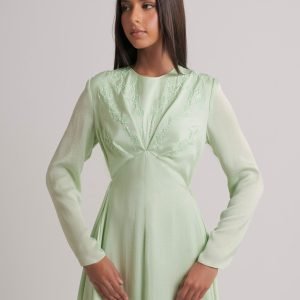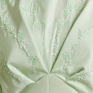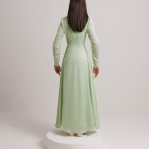 فستان من كريب باللون الأخضر الفاتح، مزين بتطريز ناعم المقاسات من اكس سمول الى اكس لارج اختيارات الطول من ٥٠ انش الى ٥٨ انش