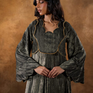 كاڤتان من مخمل مُكسر بلون أوك موس يتميز بتطريز ذهبي معدني يبرز جمال اللمعة والملمس الفاخر. يأتي بياقة مموجة وأكمام واسعة وانسيابية ليمنحك أناقة راقية وقصة طويلة بانسيابية مميزة.