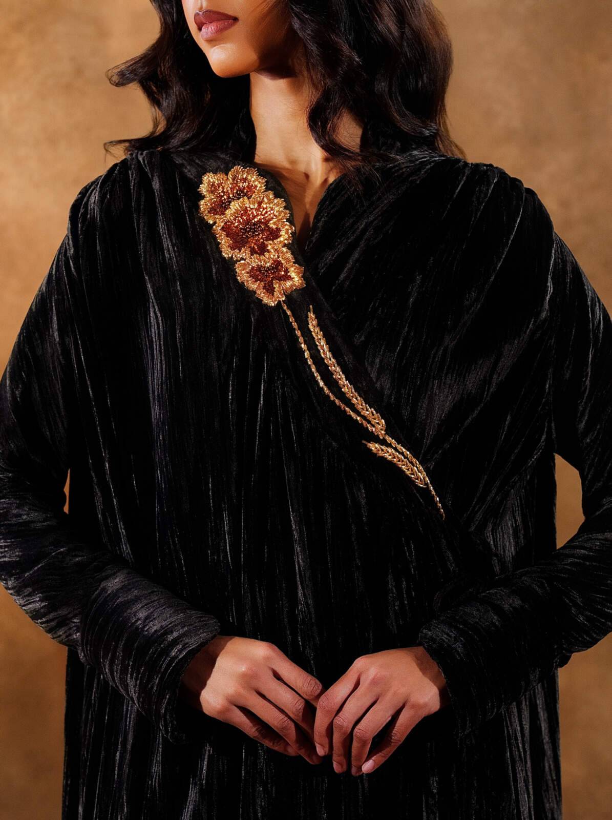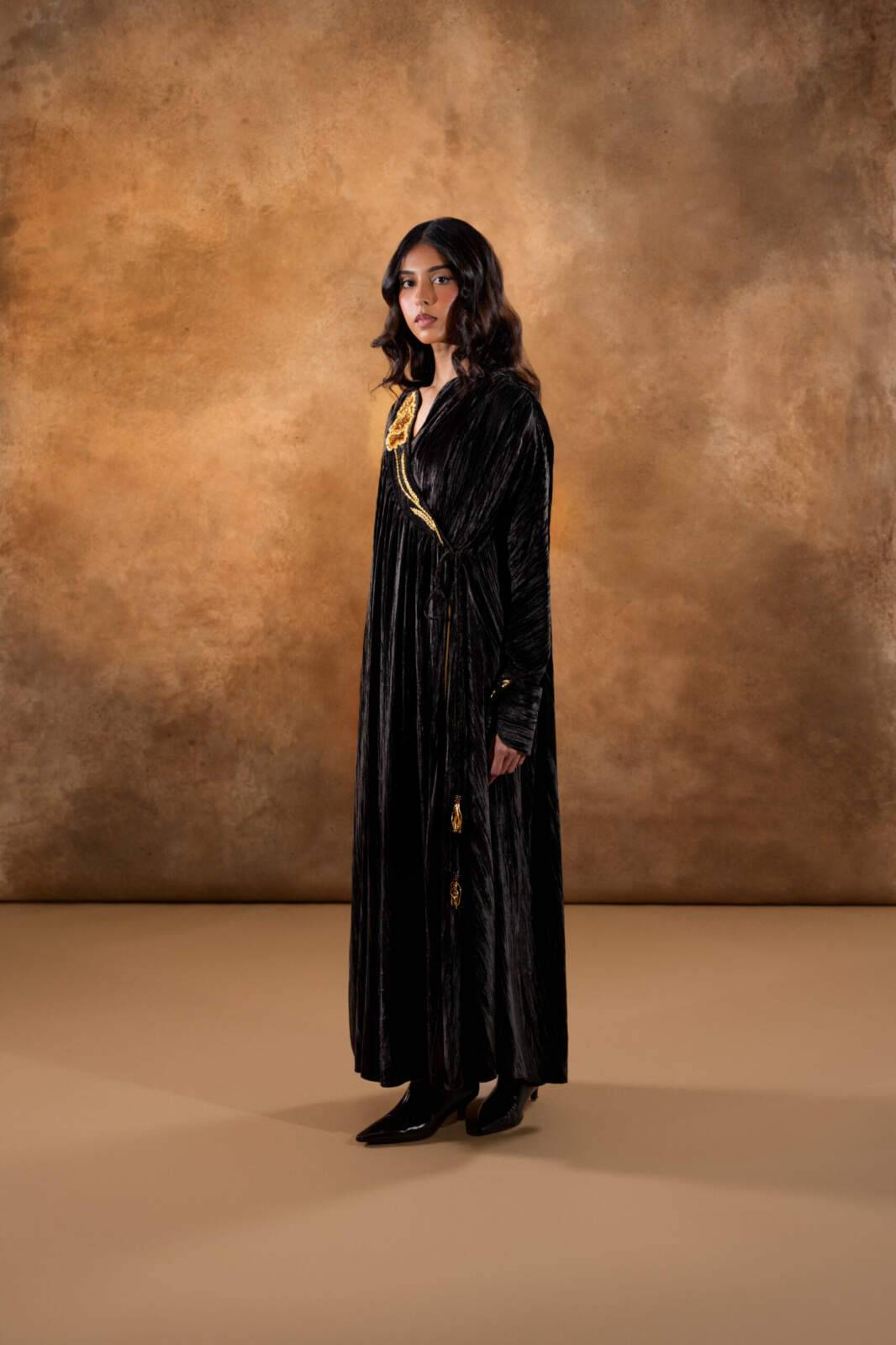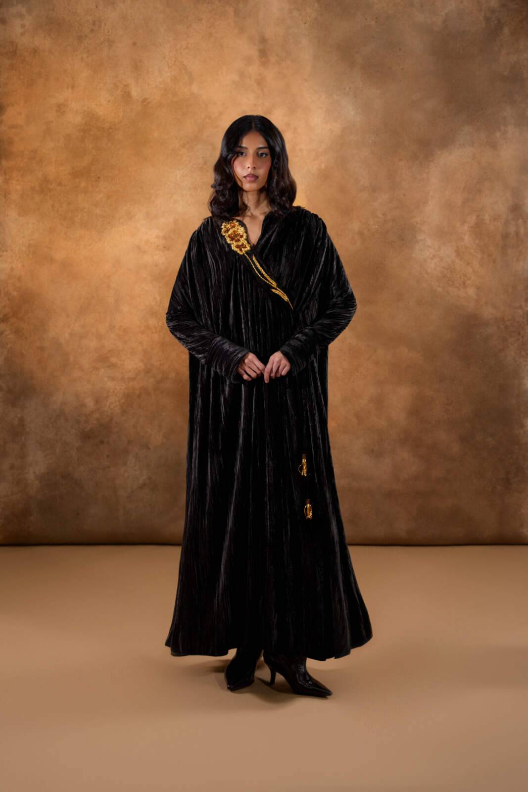 كاڤتان من مخمل مُكسر بلون الأوبسيديان يتميز بتطريز ذهبي فاخر يمتد بأناقة على منطقة الياقة. مصنوع من مخمل لامع وناعم الملمس يمنح إطلالة انسيابية طويلة وأكمام واسعة تضيف فخامة للحركة. يكتمل التصميم بلمسات شرّابات ذهبية يدوية تضفي طابعاً راقياً ومميزاً.