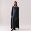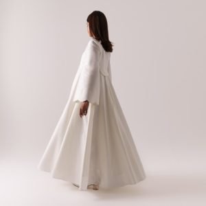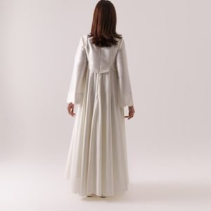 فستان بتفاصيل مموجة يتميز بحواف مطرزة بدقة على الياقة والصدر، مصنوع من قماش الشانتونغ الفاخر.