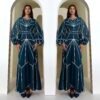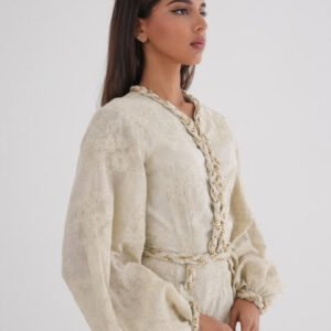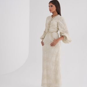 Chain braided detail fitted dress in embroidered cotton. Partially lined. Sizes: XS to XL Length: 50 inches, Longer lengths available.