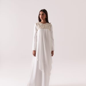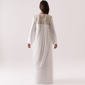 Frost-colored kaftan crafted from luxurious scuba crepe, embellished with delicate golden metallic thread embroidery and beads. The design features chiffon drapes, adding a touch of elegance and fluidity.