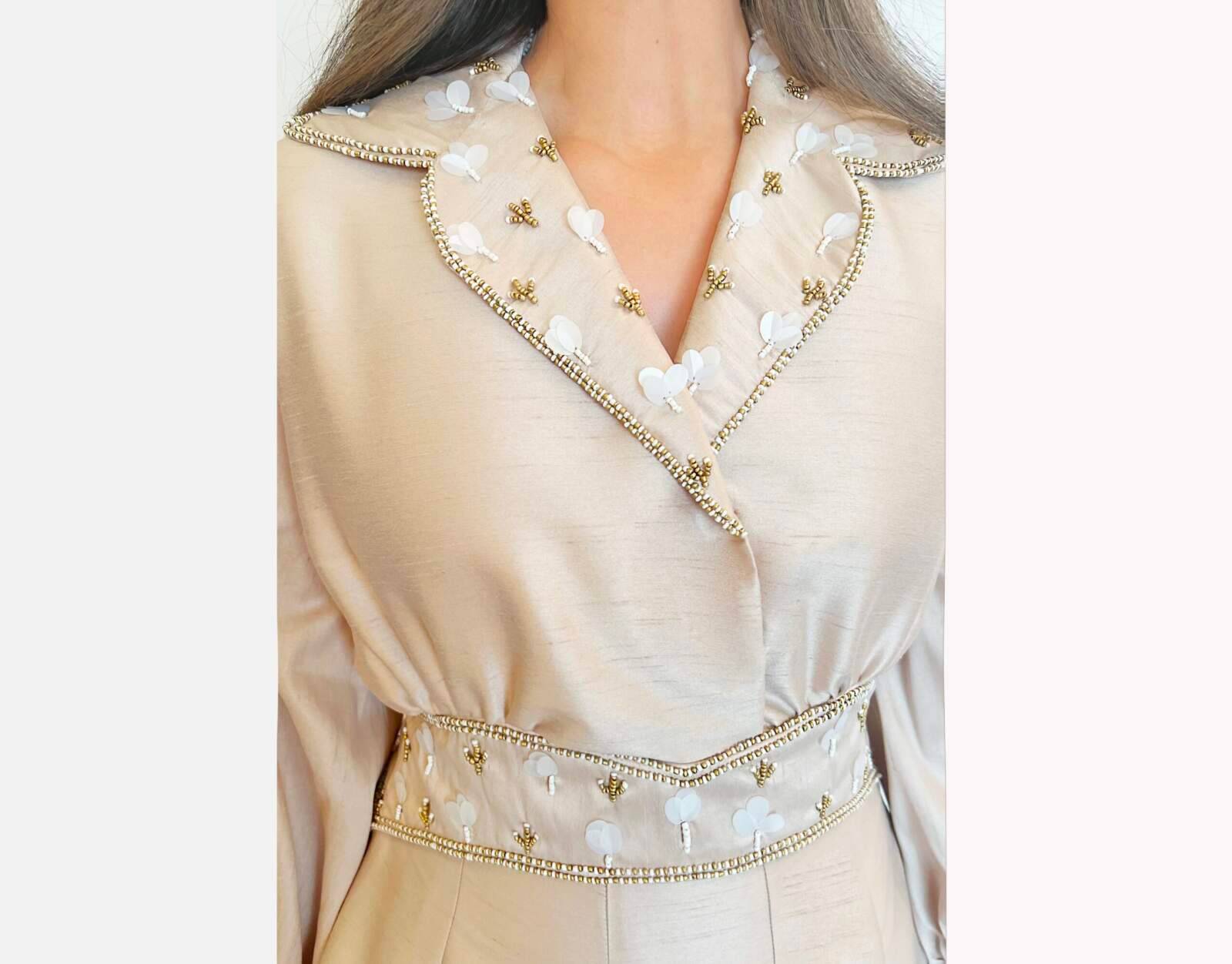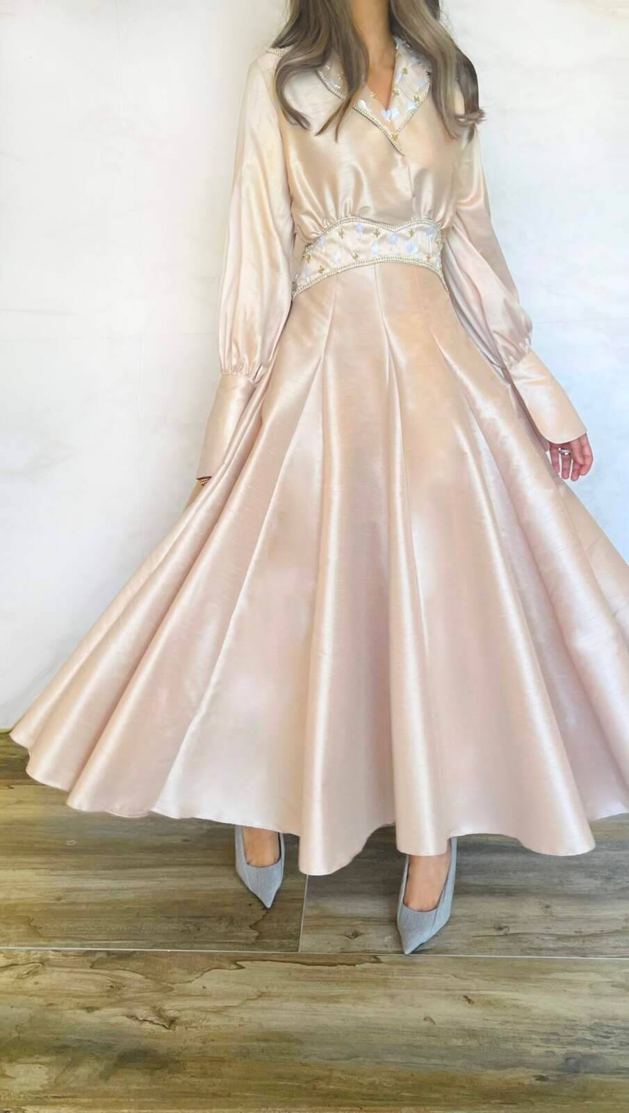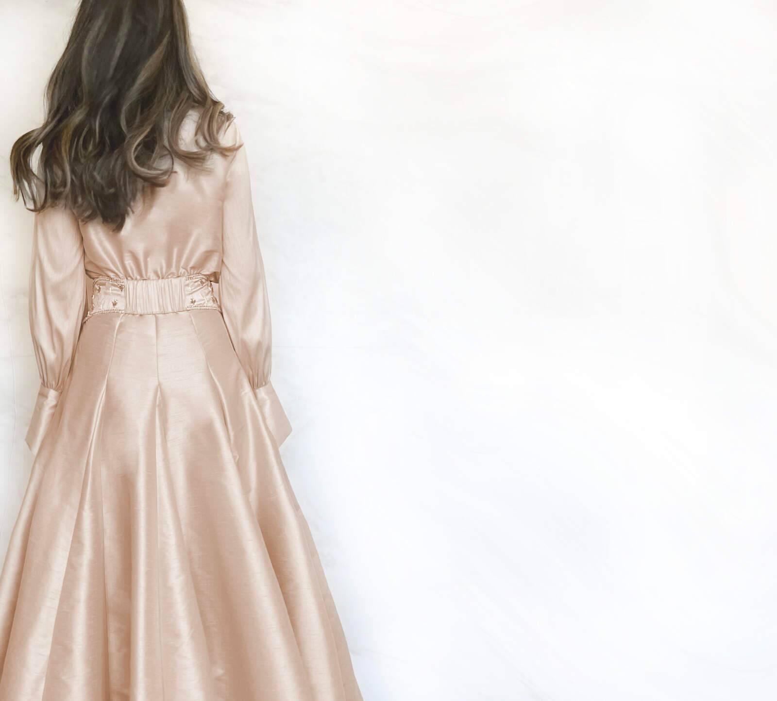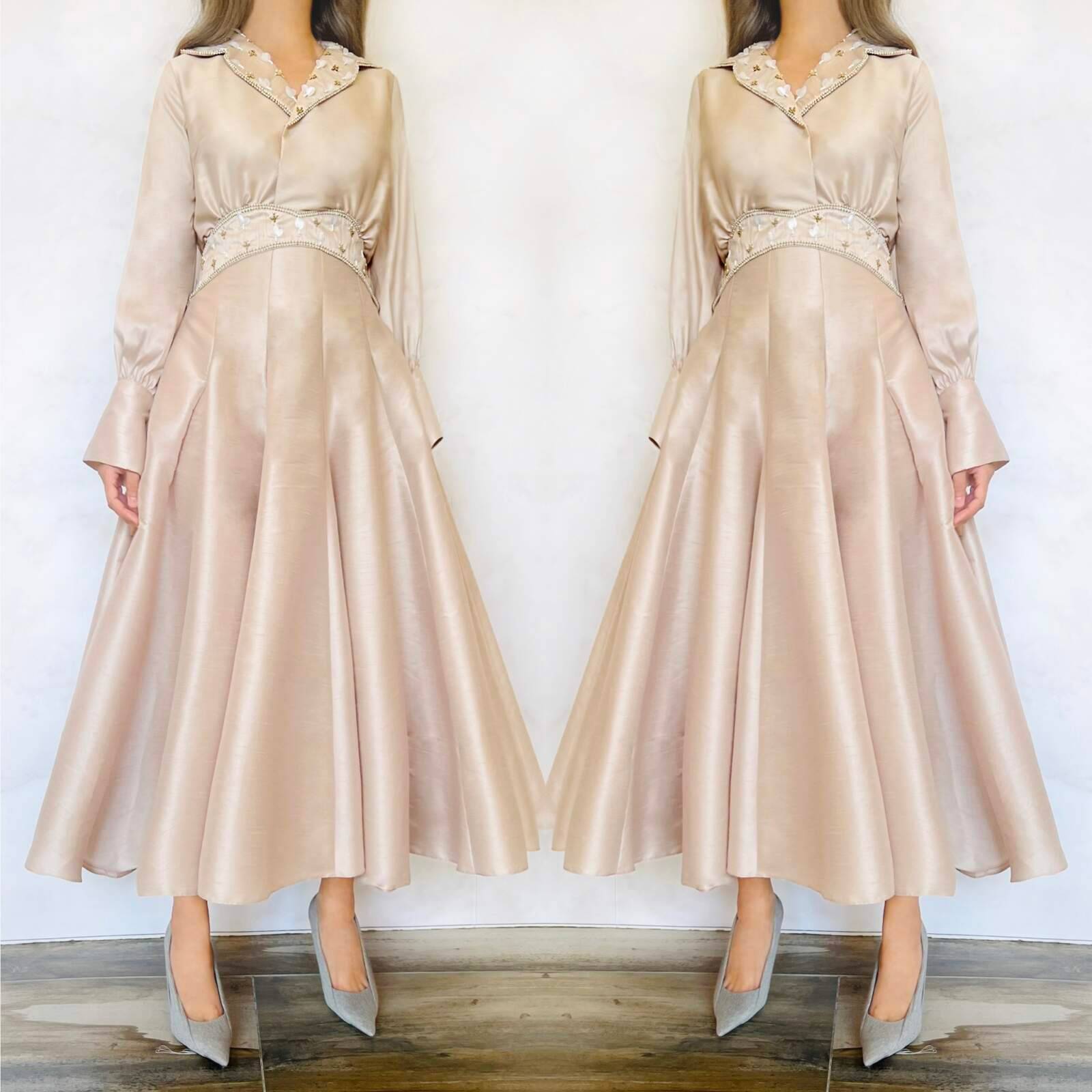 Godet embroidered shantung dress, with elastic waist for extra flexibility. Partially lined. Sizes: XS to XL Available dress lengths: 50, 52, 54 inches