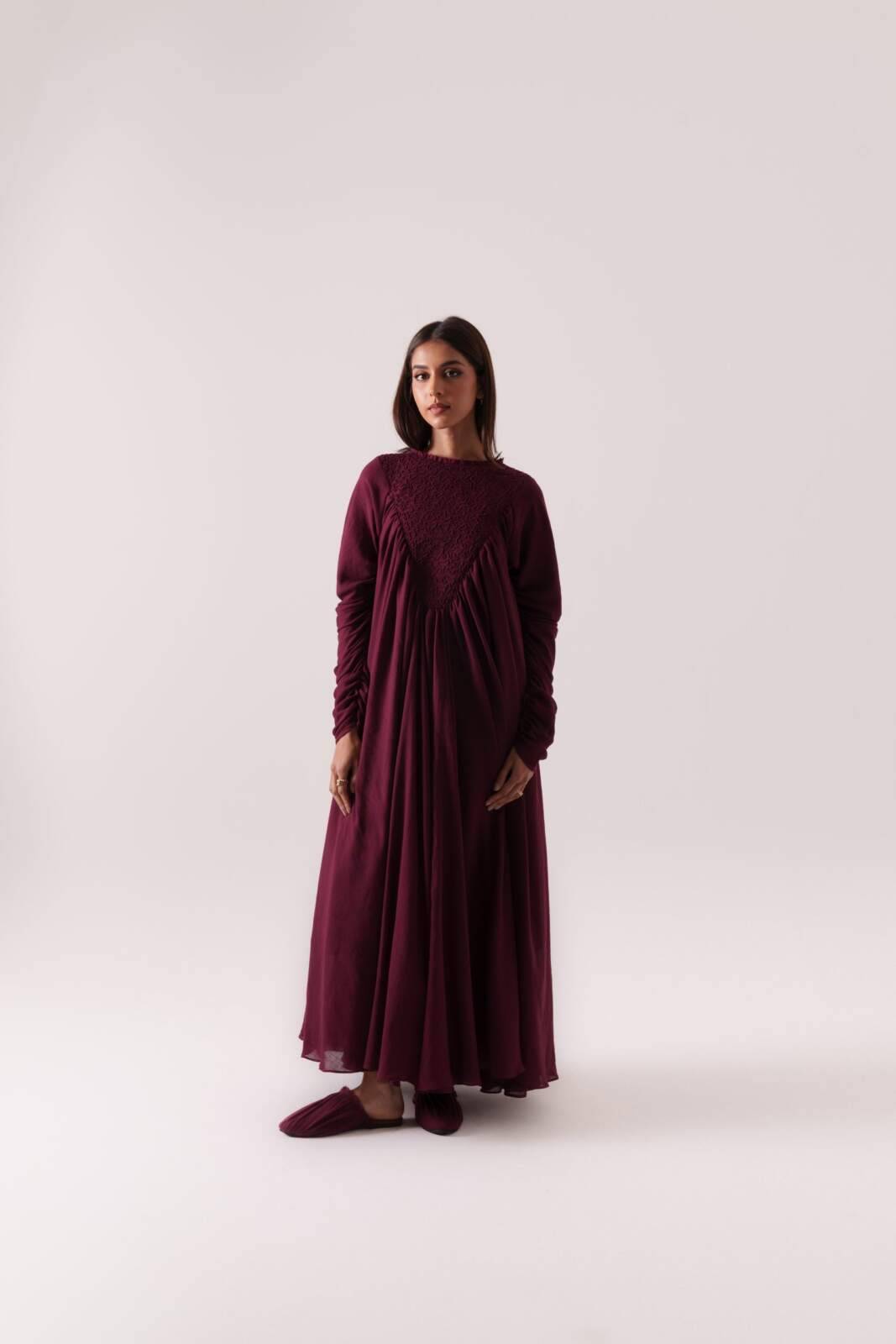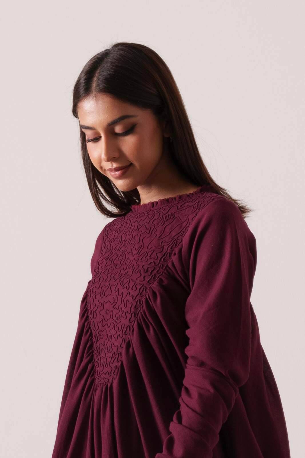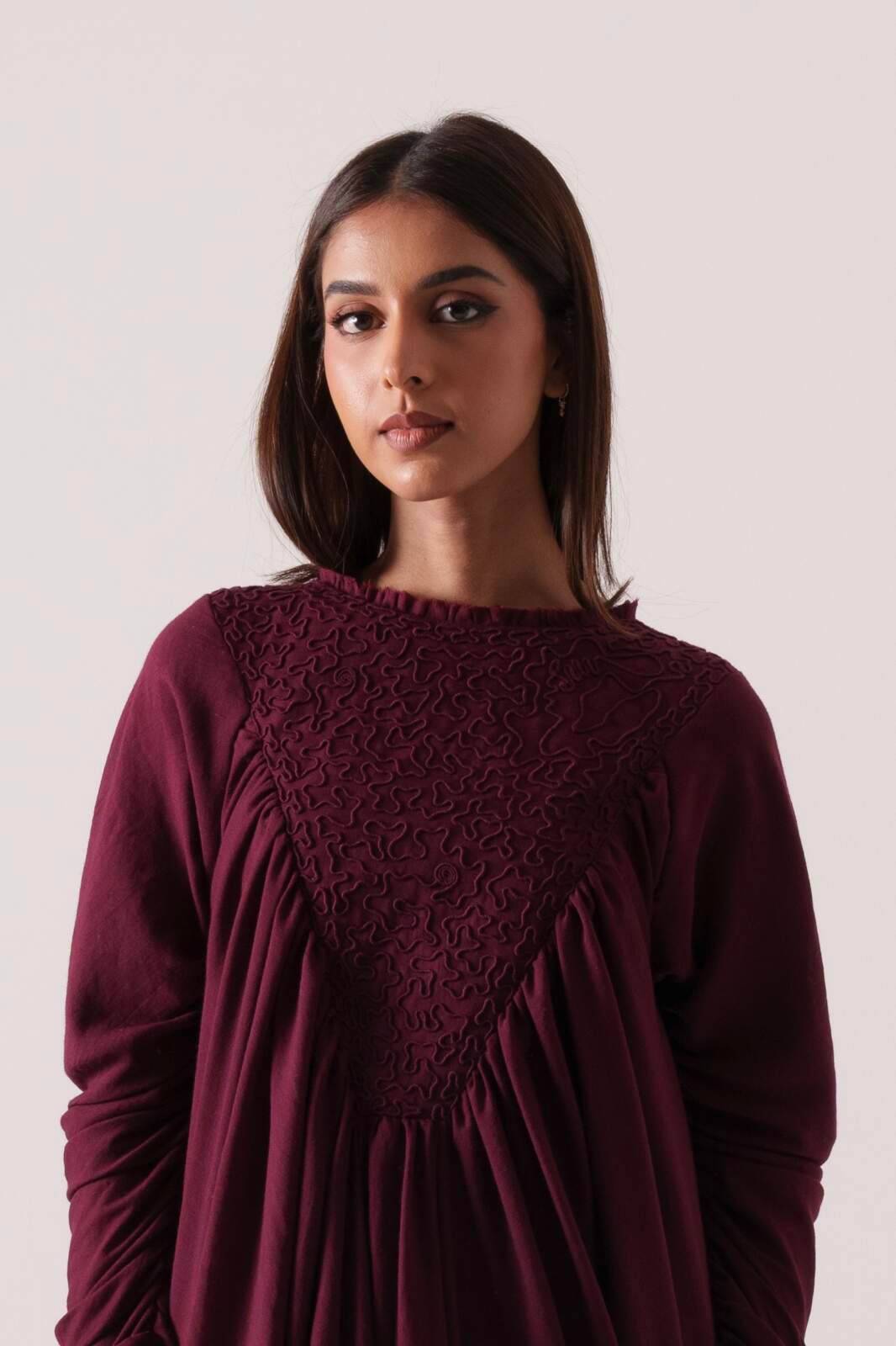 Inverted triangle embroidered bust detail, heavily ruched throughout, with an unfinished, raw-edge neckline, crafted from soft cotton fabric.