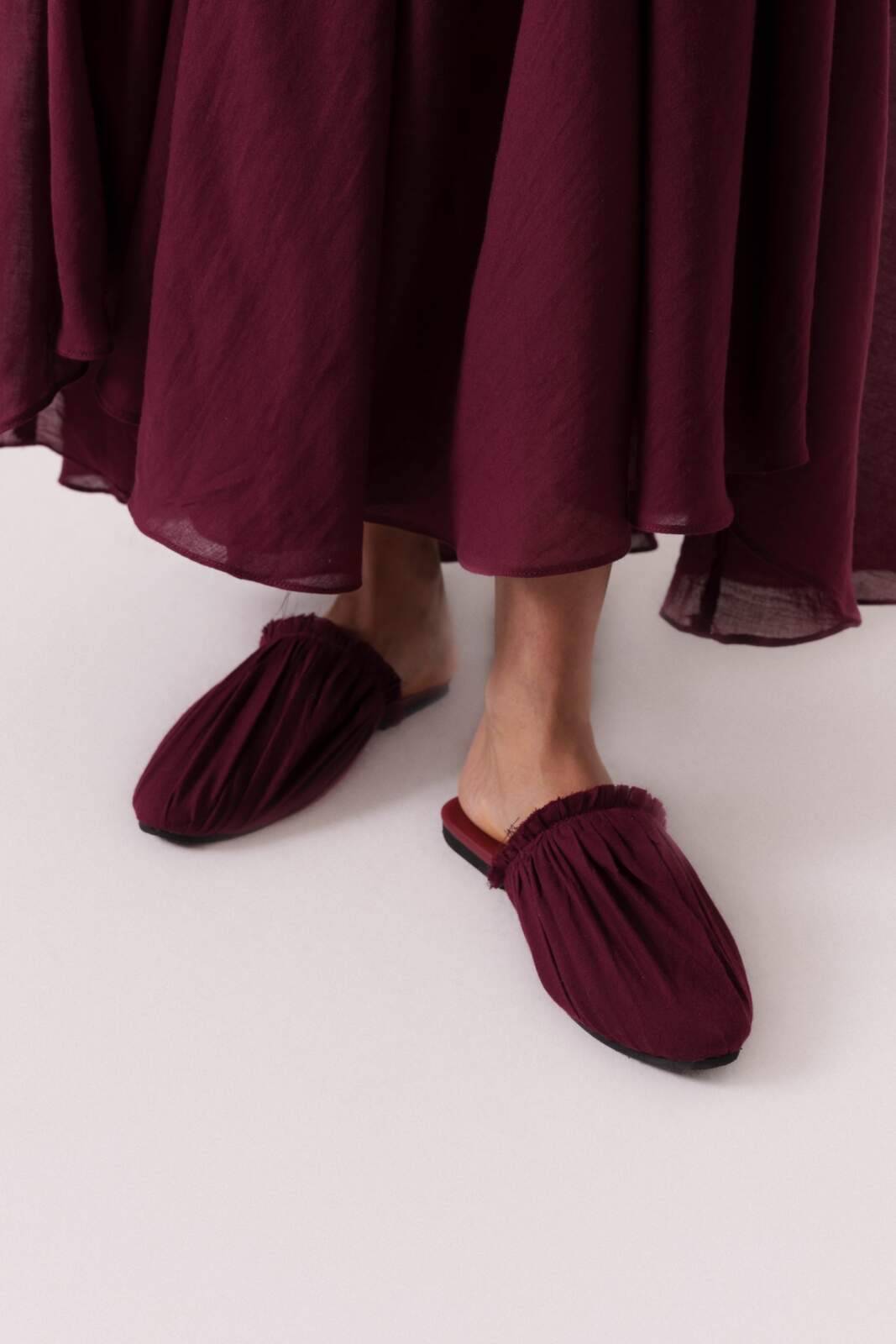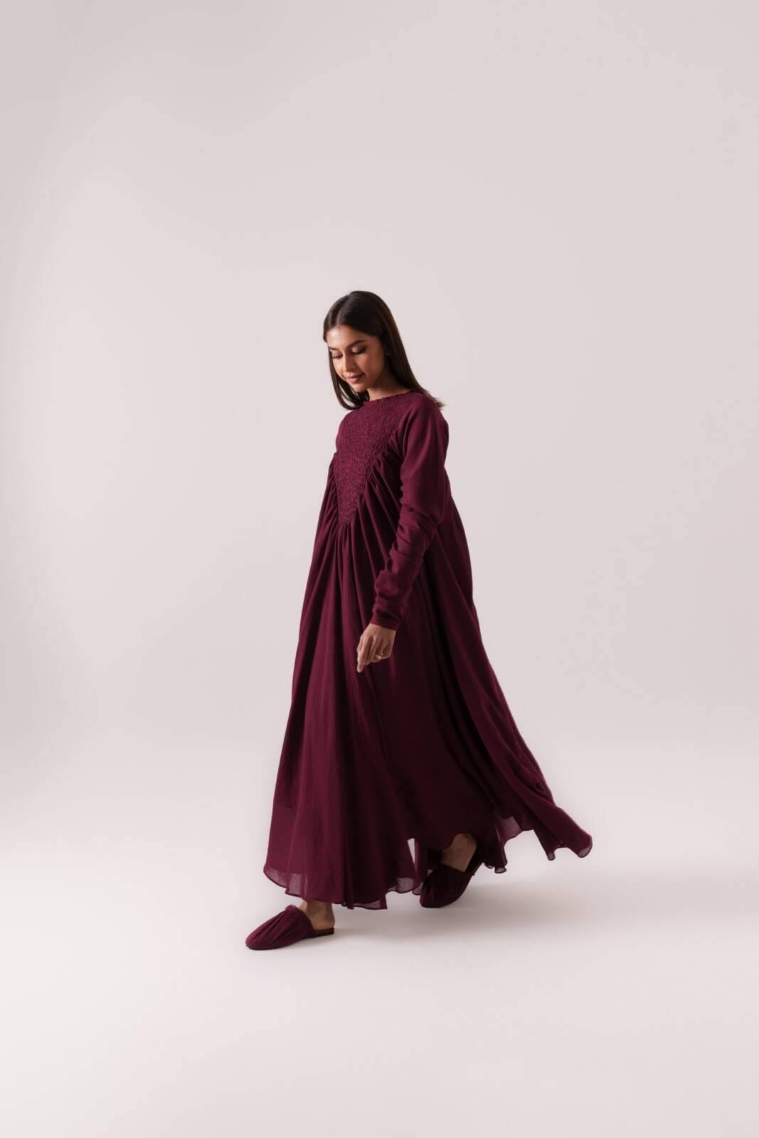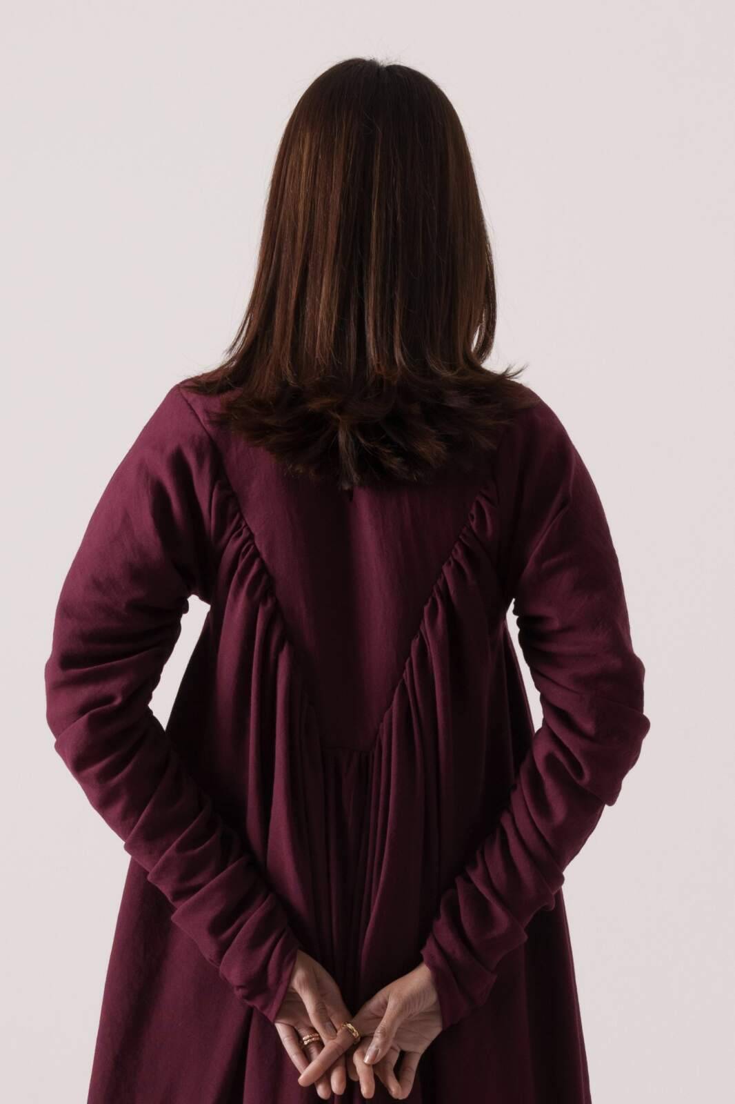Inverted triangle embroidered bust detail, heavily ruched throughout, with an unfinished, raw-edge neckline, crafted from soft cotton fabric.
