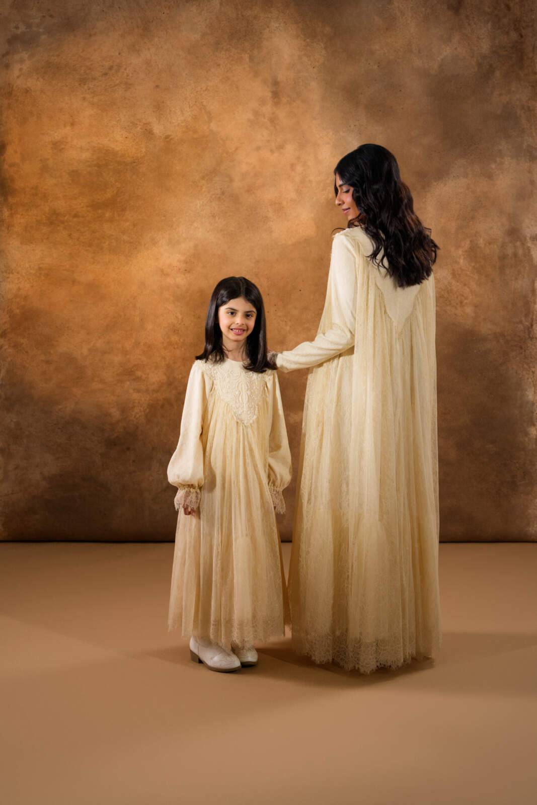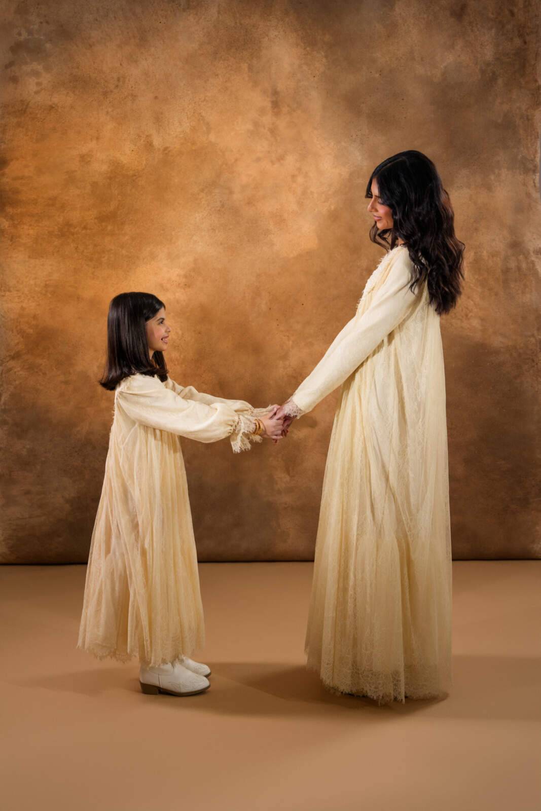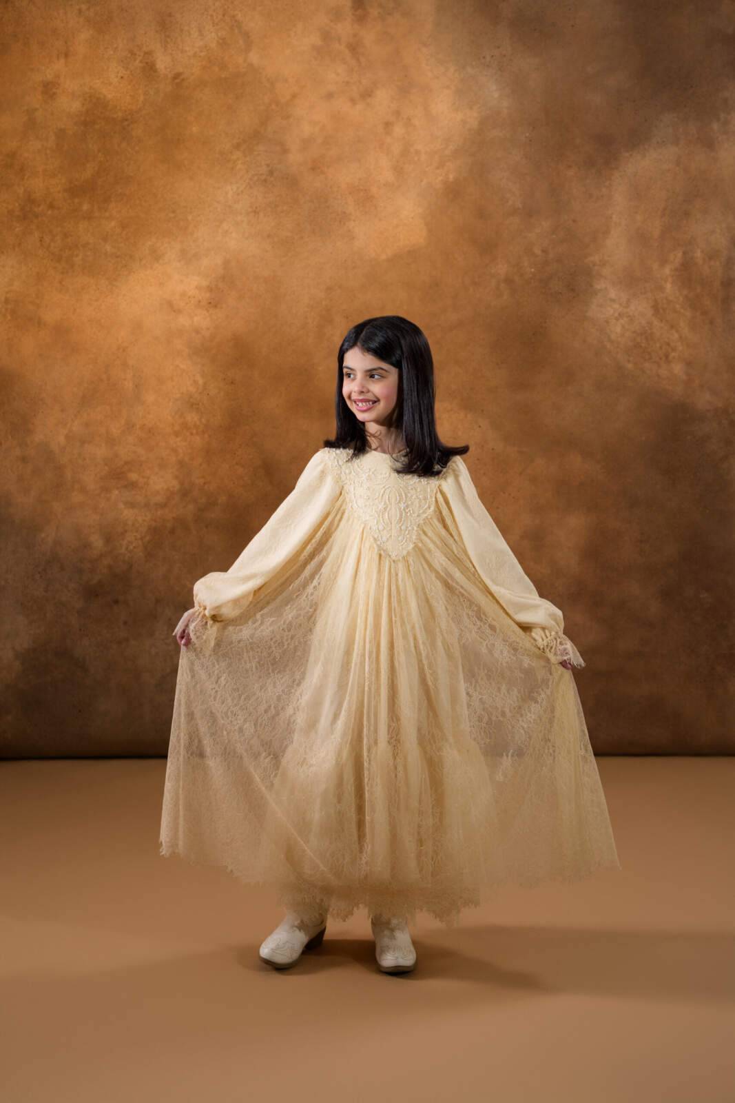 Chantilly French lace kids’ dress crafted entirely from delicate lace, featuring fine beadwork embroidery along the front yoke for a refined, angelic look. Designed with an added layer of soft tulle at the bottom hem to enhance volume and movement, it offers a dreamy, graceful silhouette perfect for special occasions.