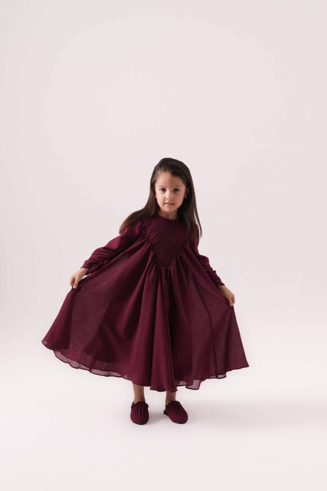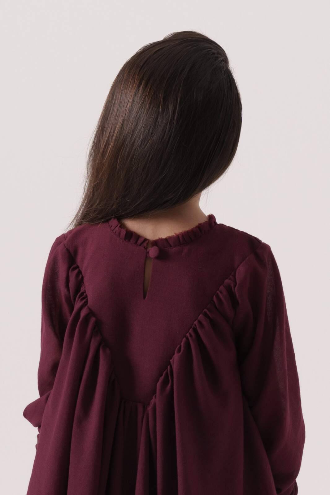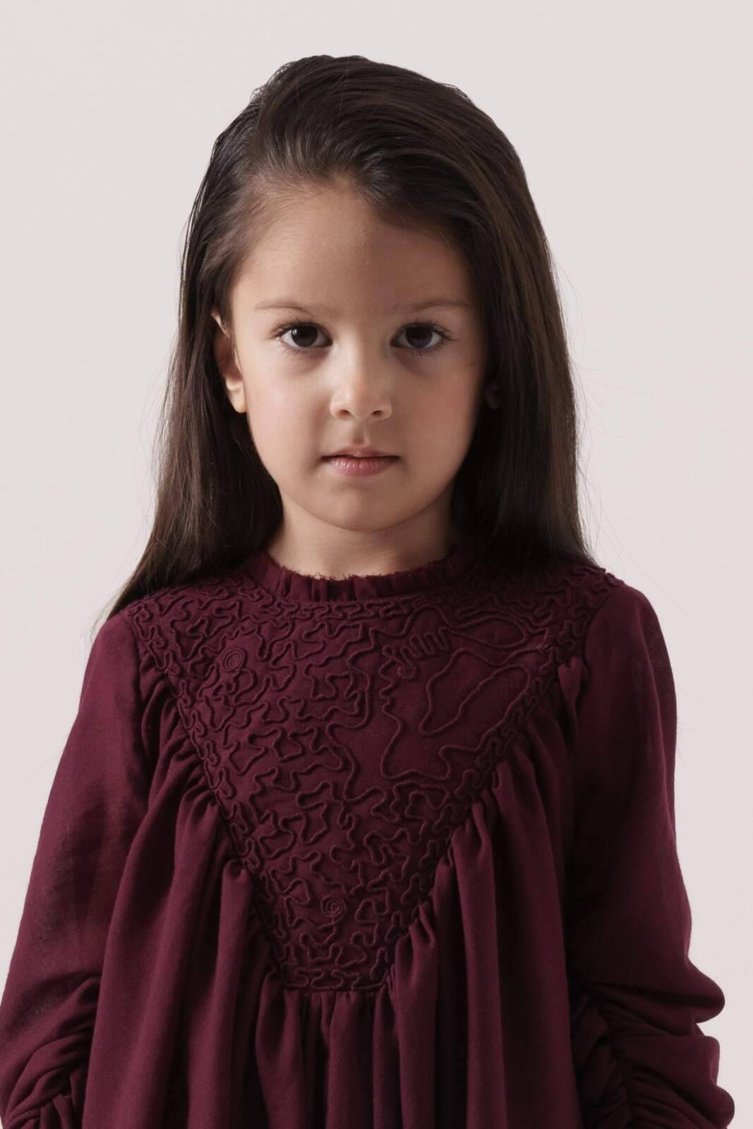 Inverted triangle embroidered bust detail, heavily ruched throughout, with an unfinished, raw-edge neckline, crafted from soft cotton fabric. Sizes: 3 years to 12 years