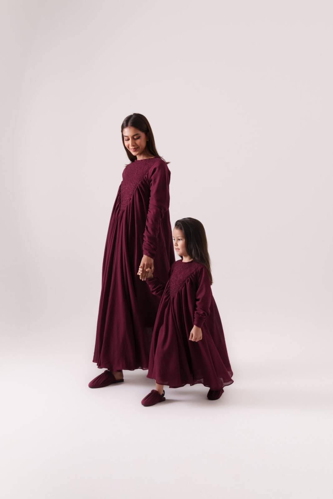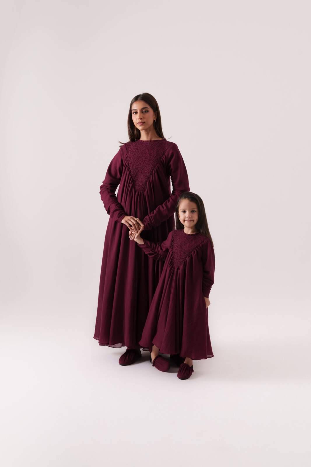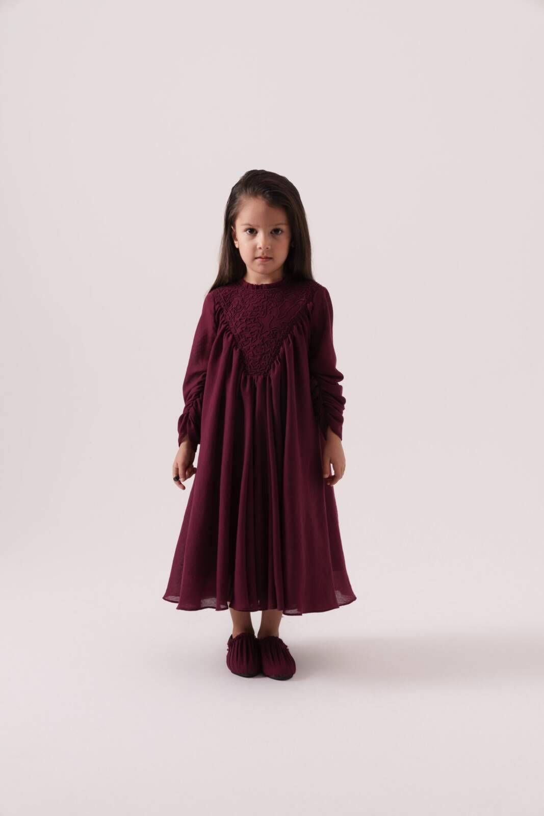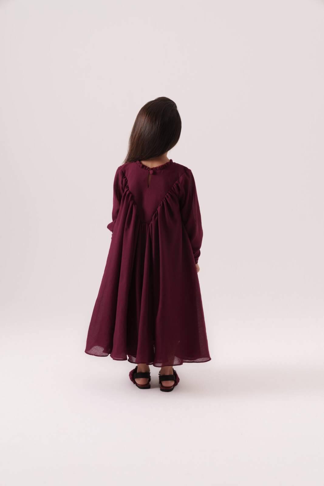 Inverted triangle embroidered bust detail, heavily ruched throughout, with an unfinished, raw-edge neckline, crafted from soft cotton fabric. Sizes: 3 years to 12 years