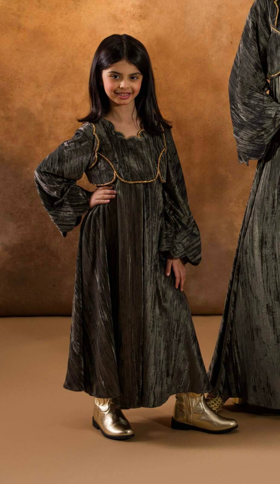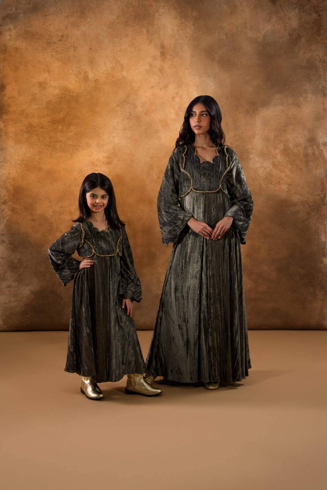 Oakmoss crinkled-velvet kaftan featuring gold metallic embroidery that highlights its textured, lustrous finish. Designed with a scalloped neckline and wide sleeves, it offers an elegant, comfortable silhouette perfect for special occasions.