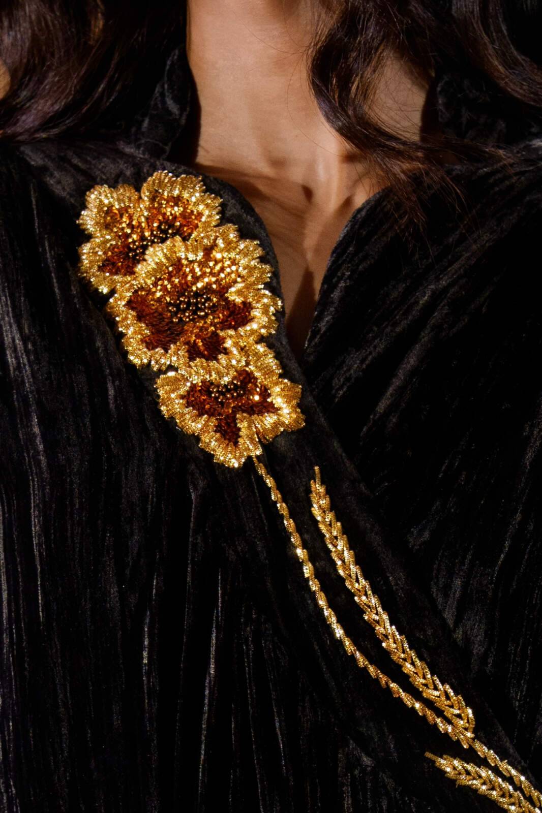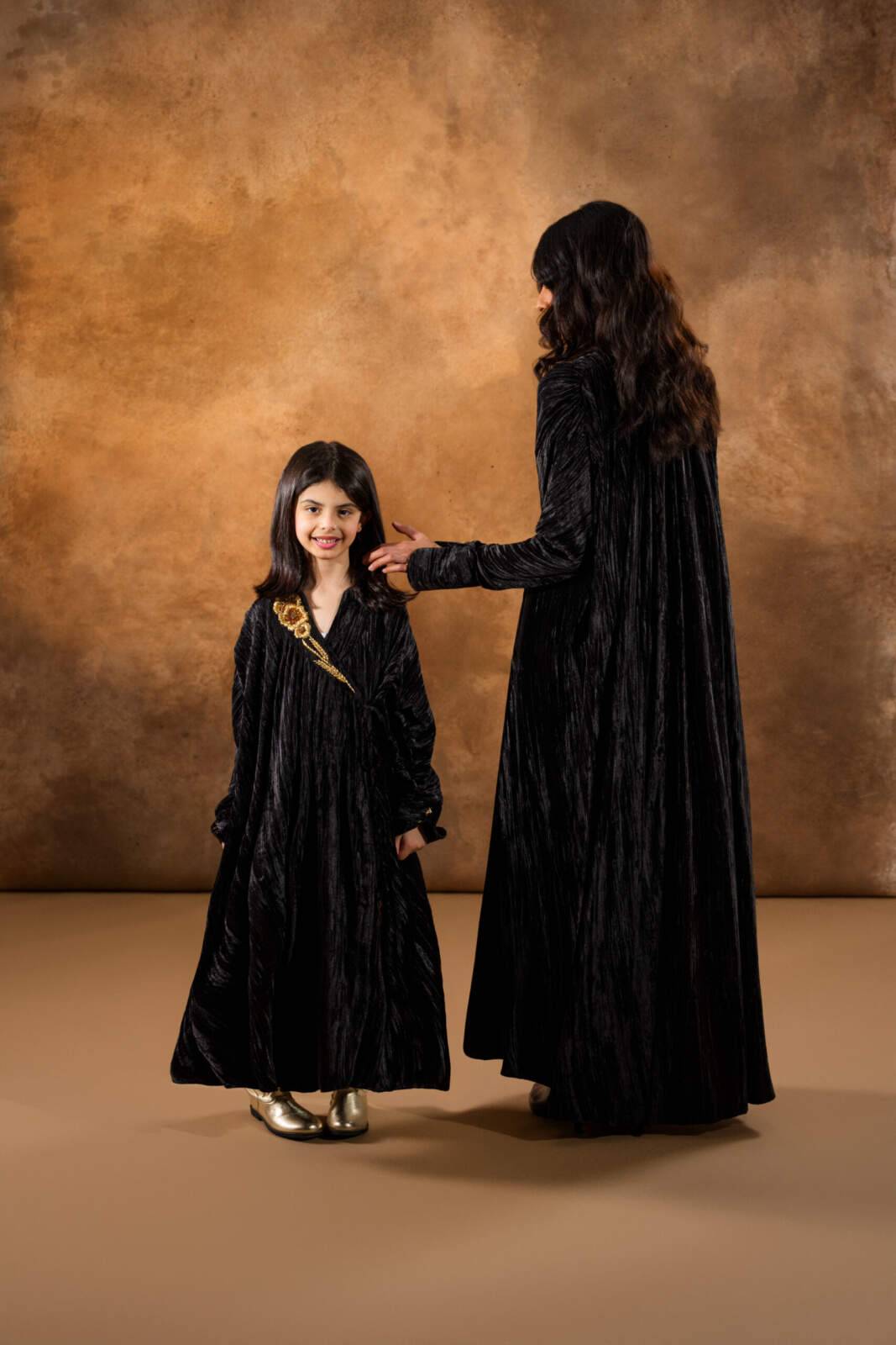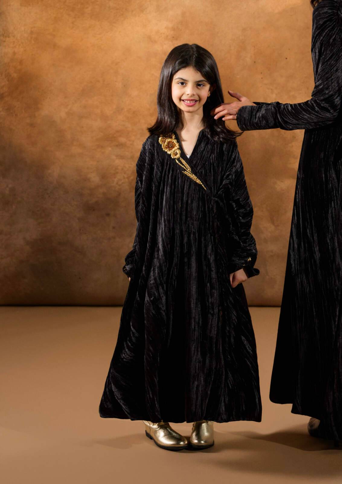 Obsidian crinkled-velvet kaftan designed for kids, featuring delicate gold embroidery along the neckline. Made from soft, textured velvet, it offers a comfortable yet elegant silhouette with wide sleeves and gentle movement—perfect for special occasions with a refined touch.