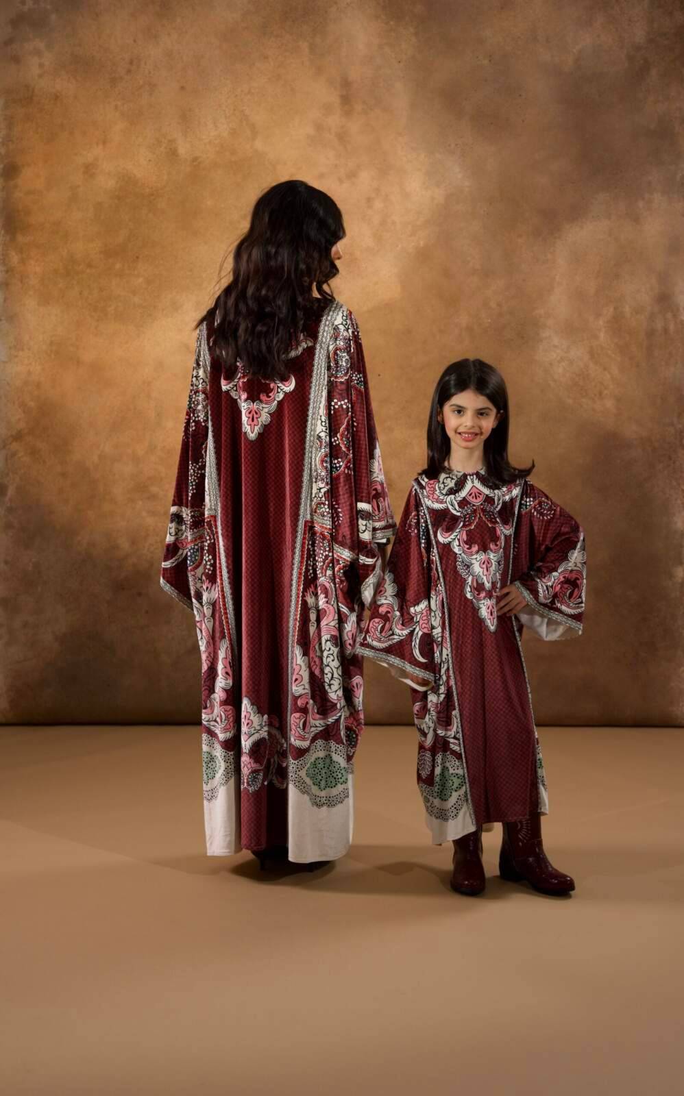 Printed velvet kids’ dress crafted from rich printed velvet, featuring an elegant all-over pattern that highlights its refined yet playful character. Designed in a relaxed, straight-cut silhouette with wide sleeves, it offers comfort and ease of movement while maintaining a polished look—perfect for special occasions and festive gatherings.
