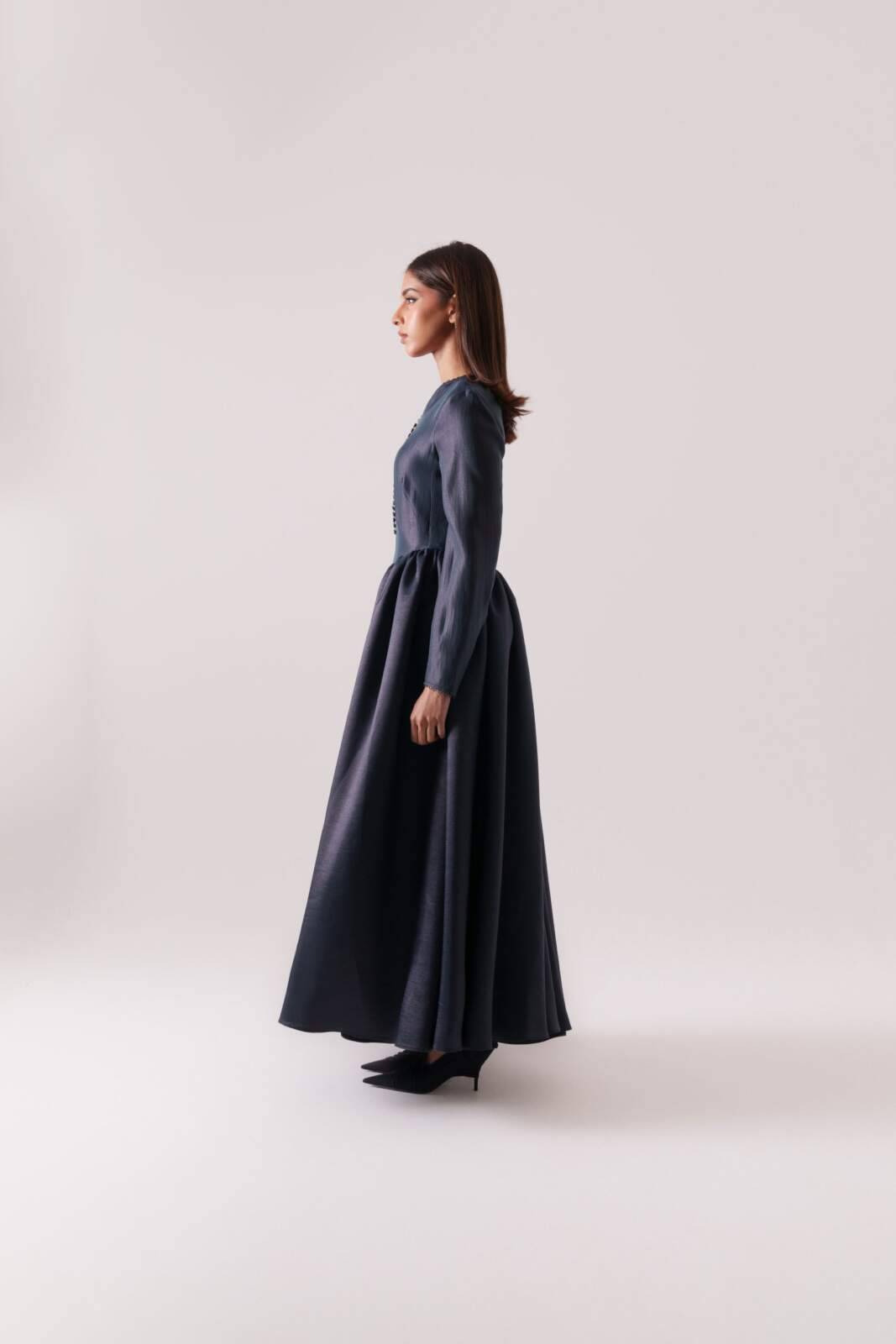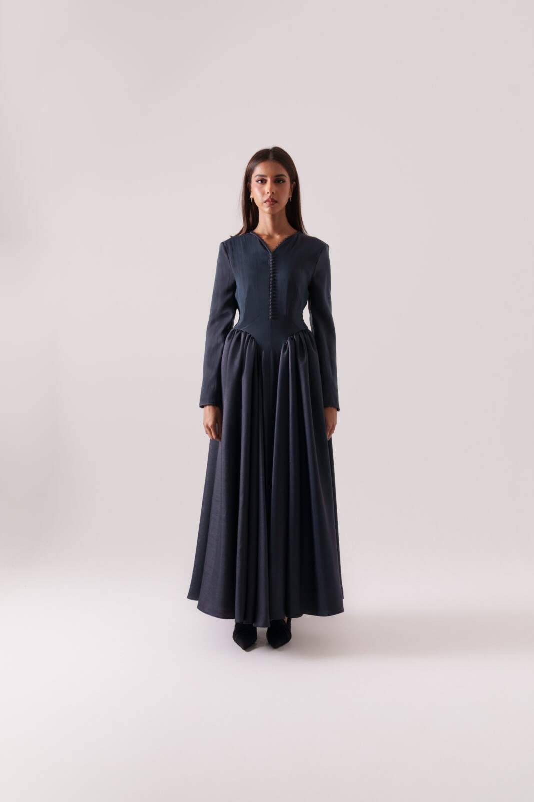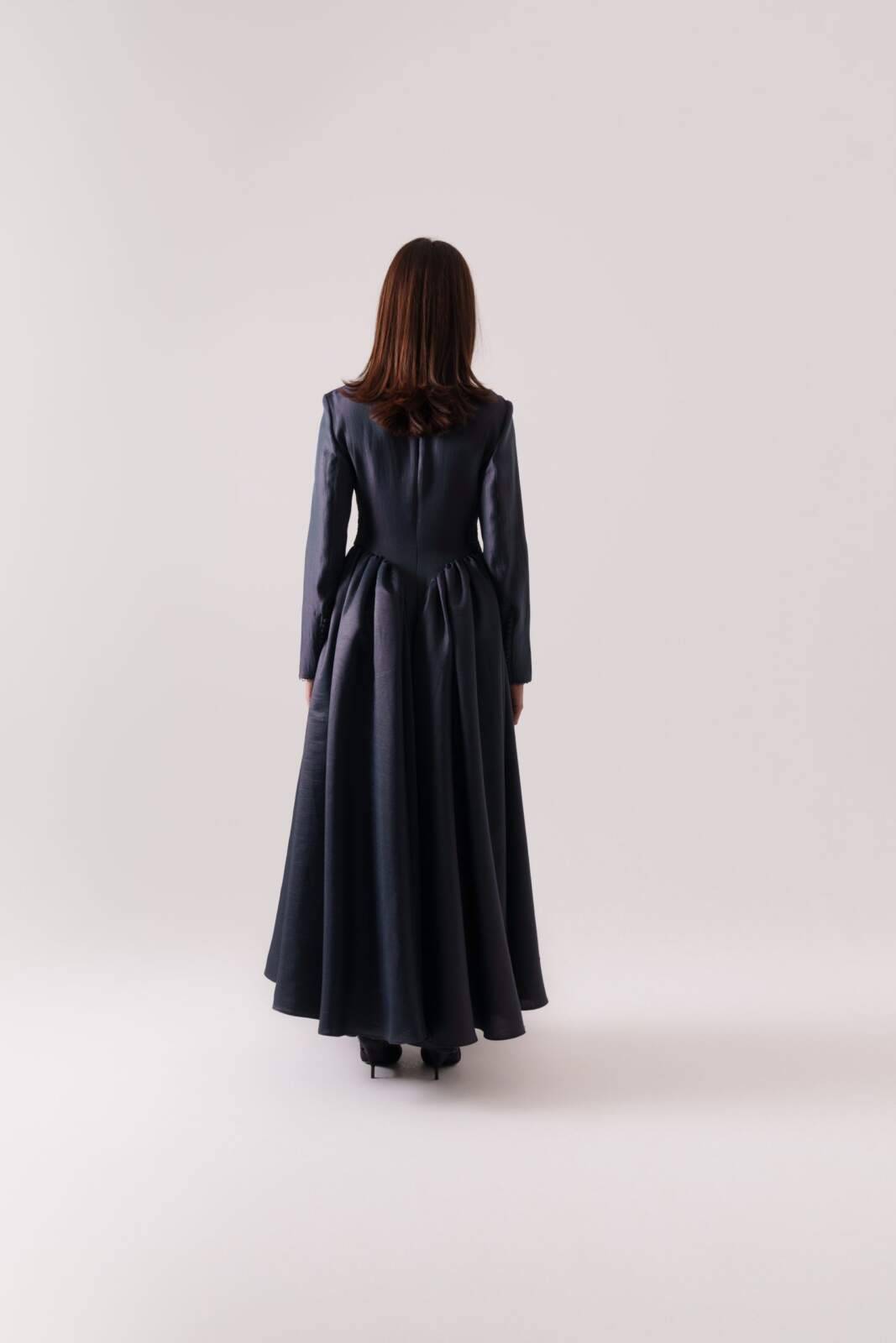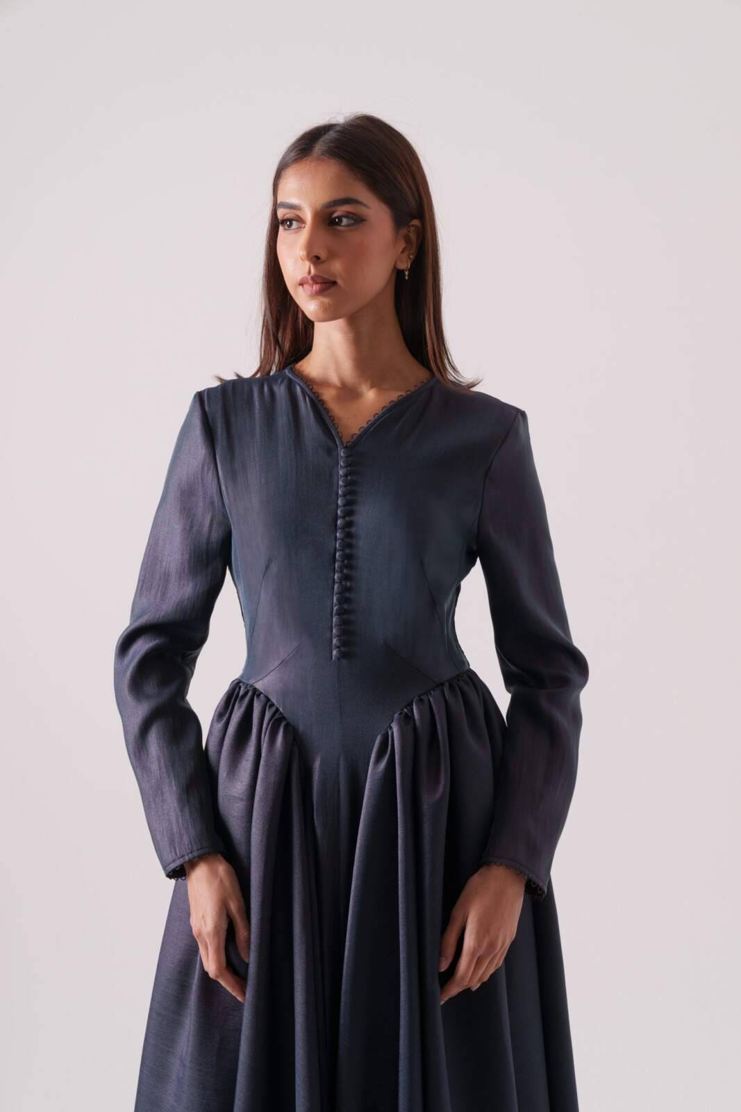 Moonlit-hued silk crepe dress featuring side pleats that flatter the figure and front buttons that define the silhouette. Sizes: XS to XL Lengths: 50, 52, 54, 56, 58
