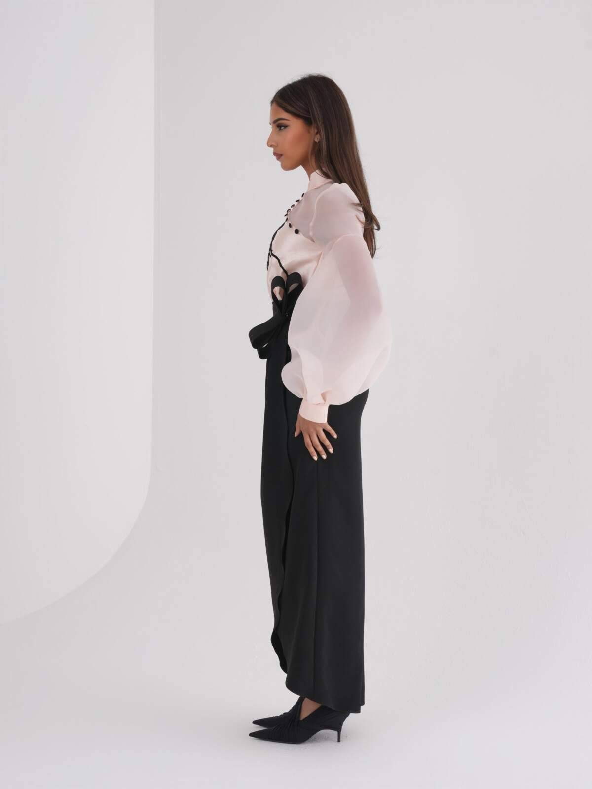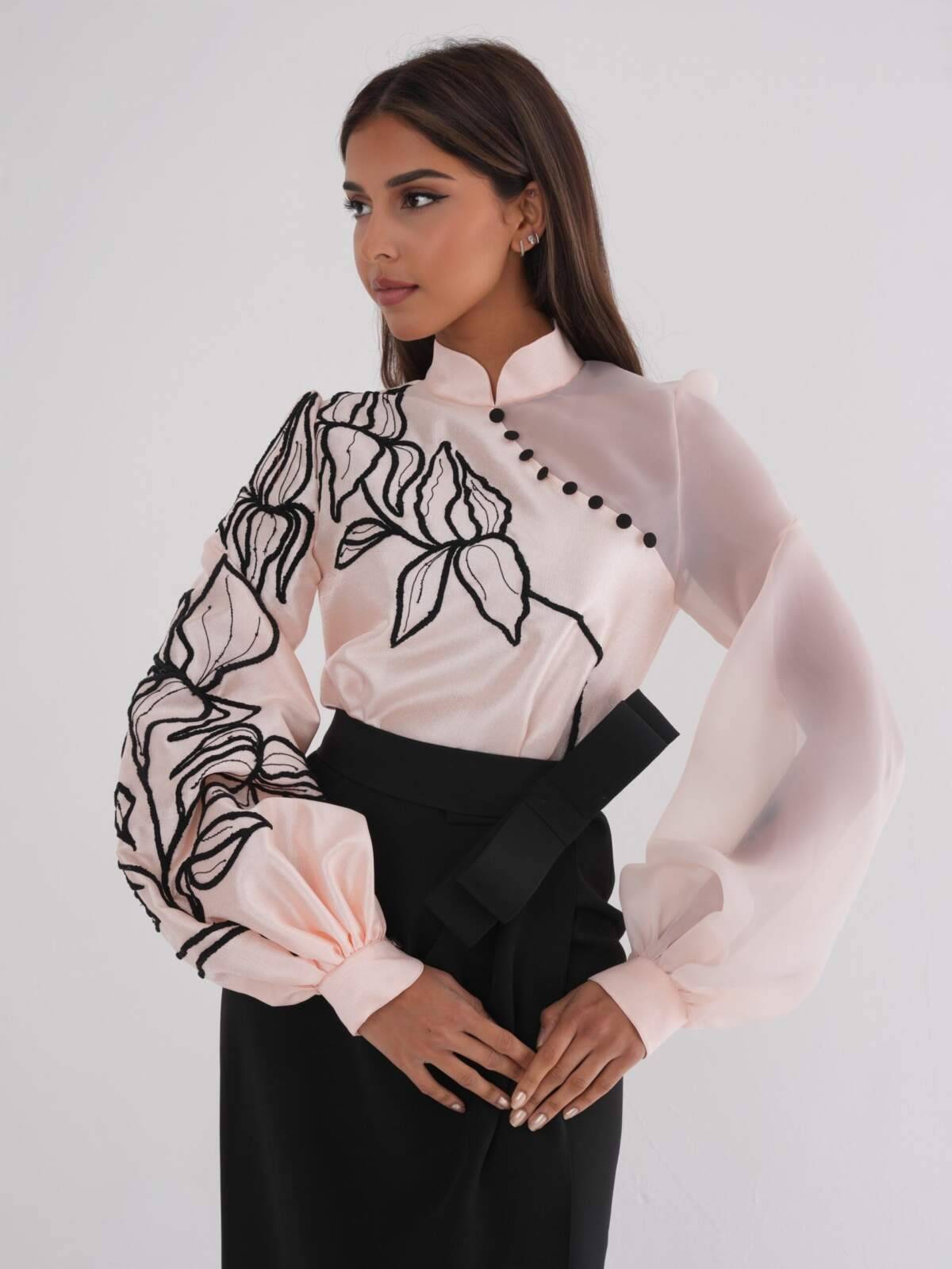 Peach organza and silk dress with floral embroidery, a wrap skirt in a stretchy fabric for more flexibility. The dress comes with a belt. Sizes: XS to XL