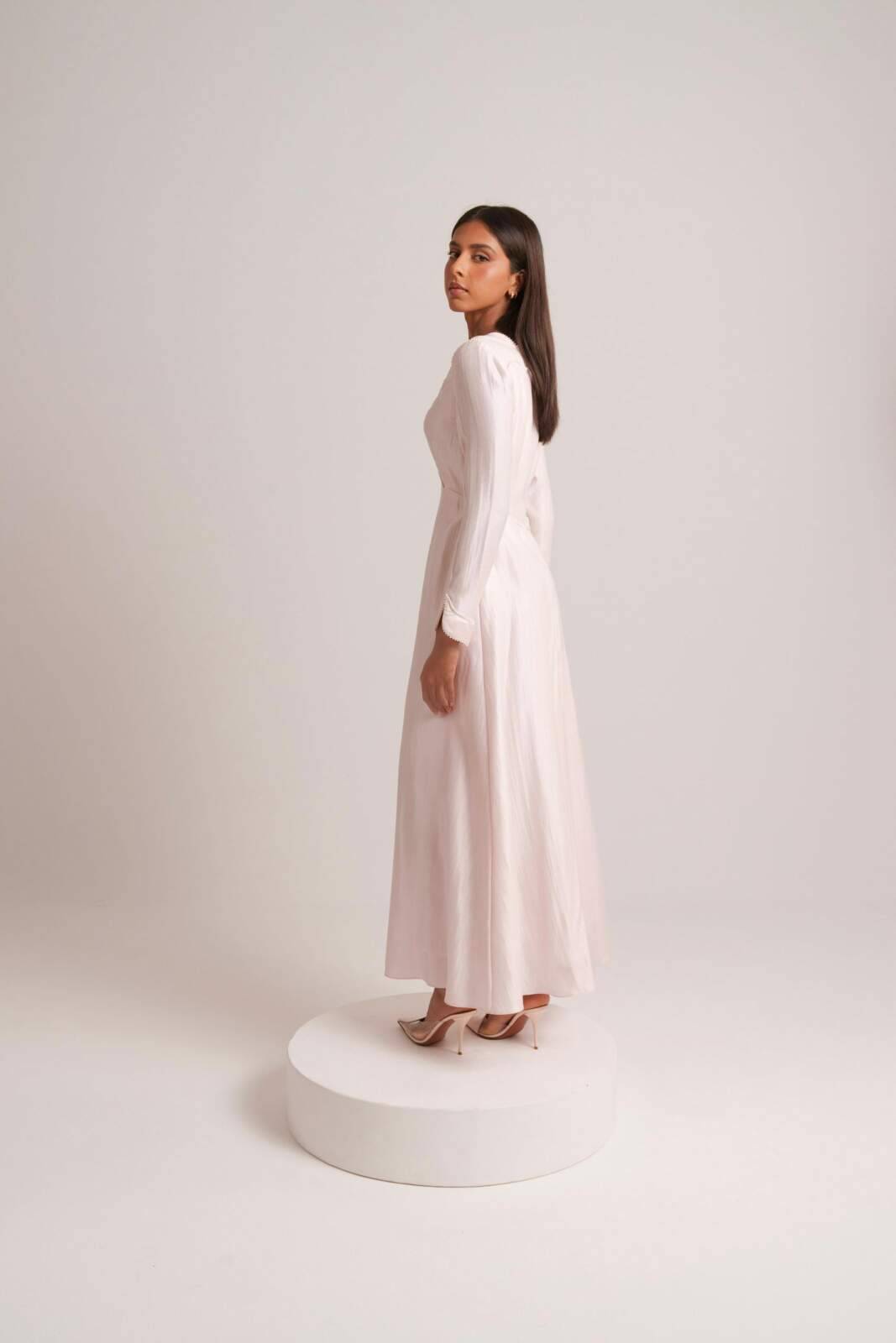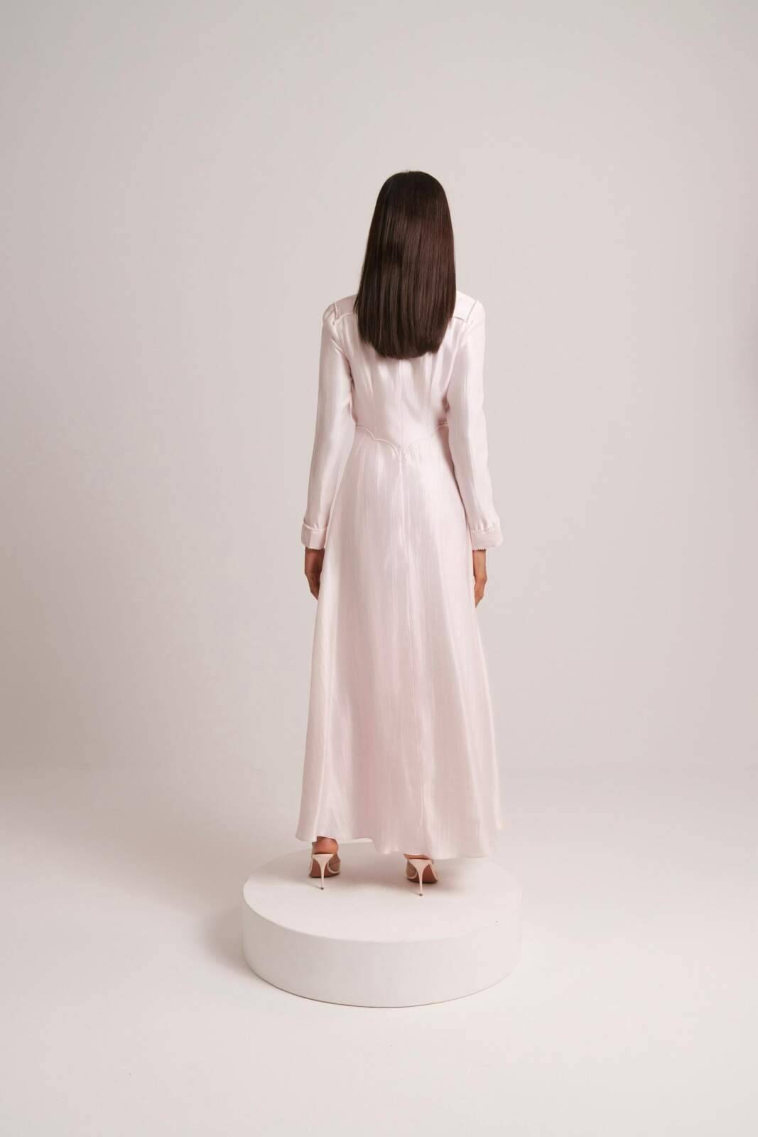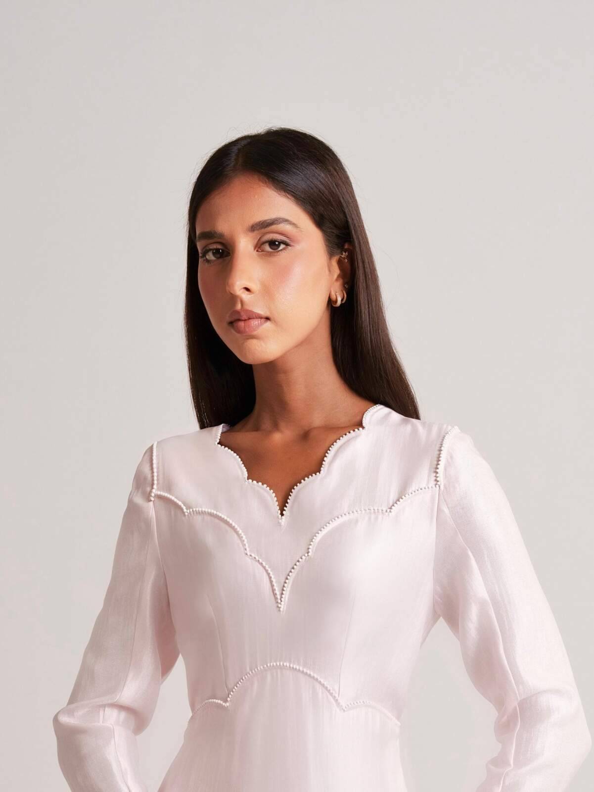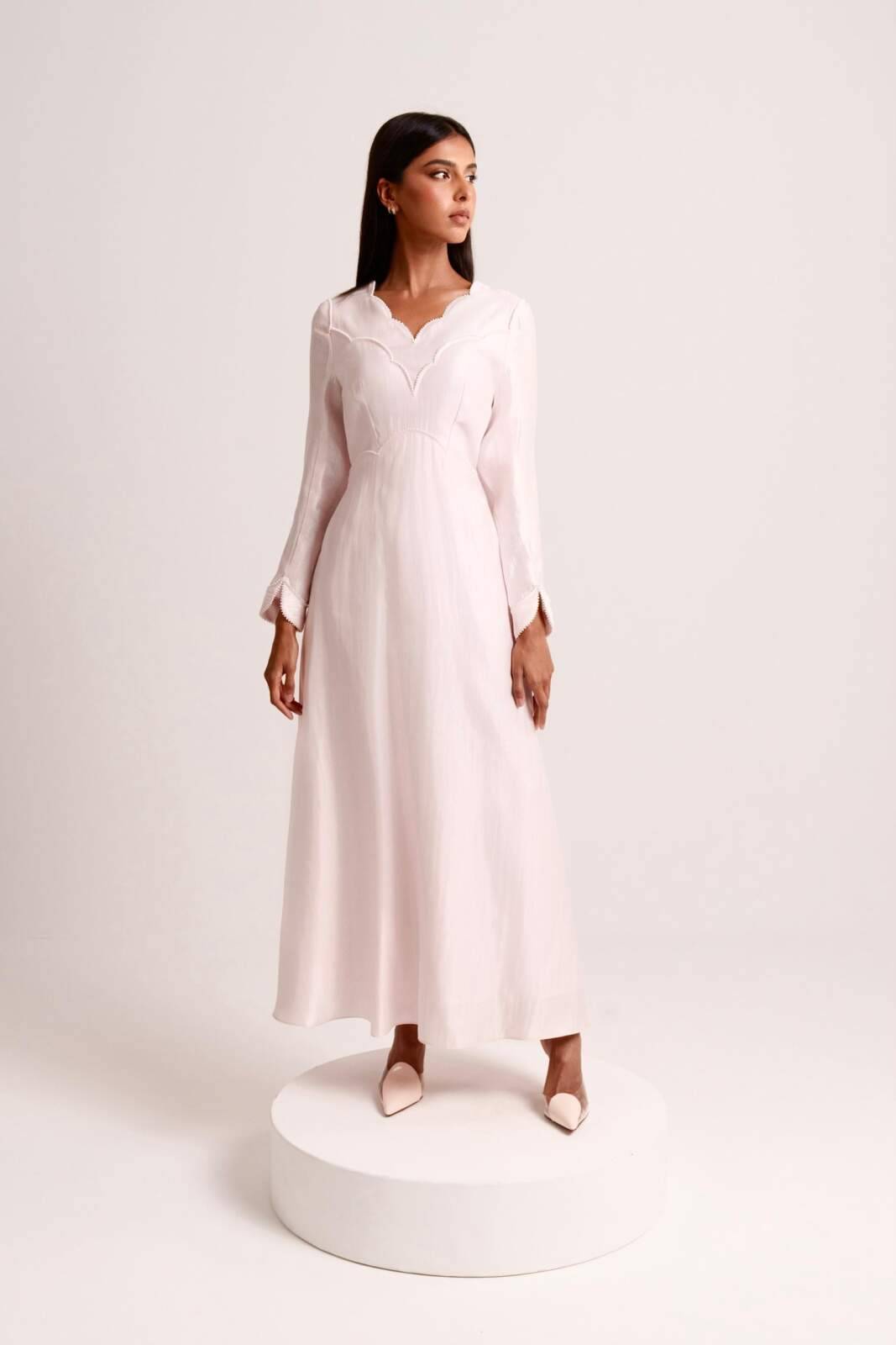 Petal pink dress featuring delicate scallop detailing and fine embroidery along the edges. Crafted from a subtly lustrous fabric, it offers a soft, feminine silhouette with long sleeves and a flattering neckline.