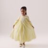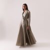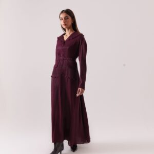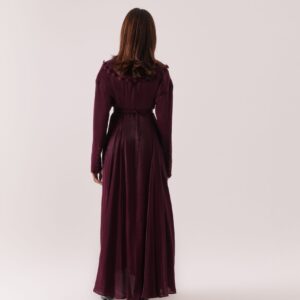 Plum dress with a wide statement collar, button details, and an adjustable belt for a cinched silhouette.