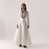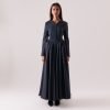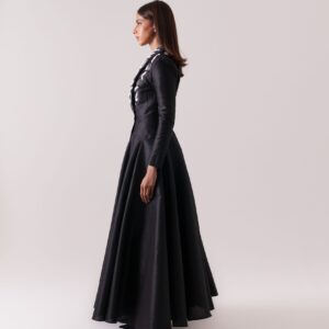Raven black two-piece dress in textured shantung fabric, featuring godet side cuts and a heavily embroidered collar. Sizes: XS to XL Lengths: 50, 52, 54, 56 inches
