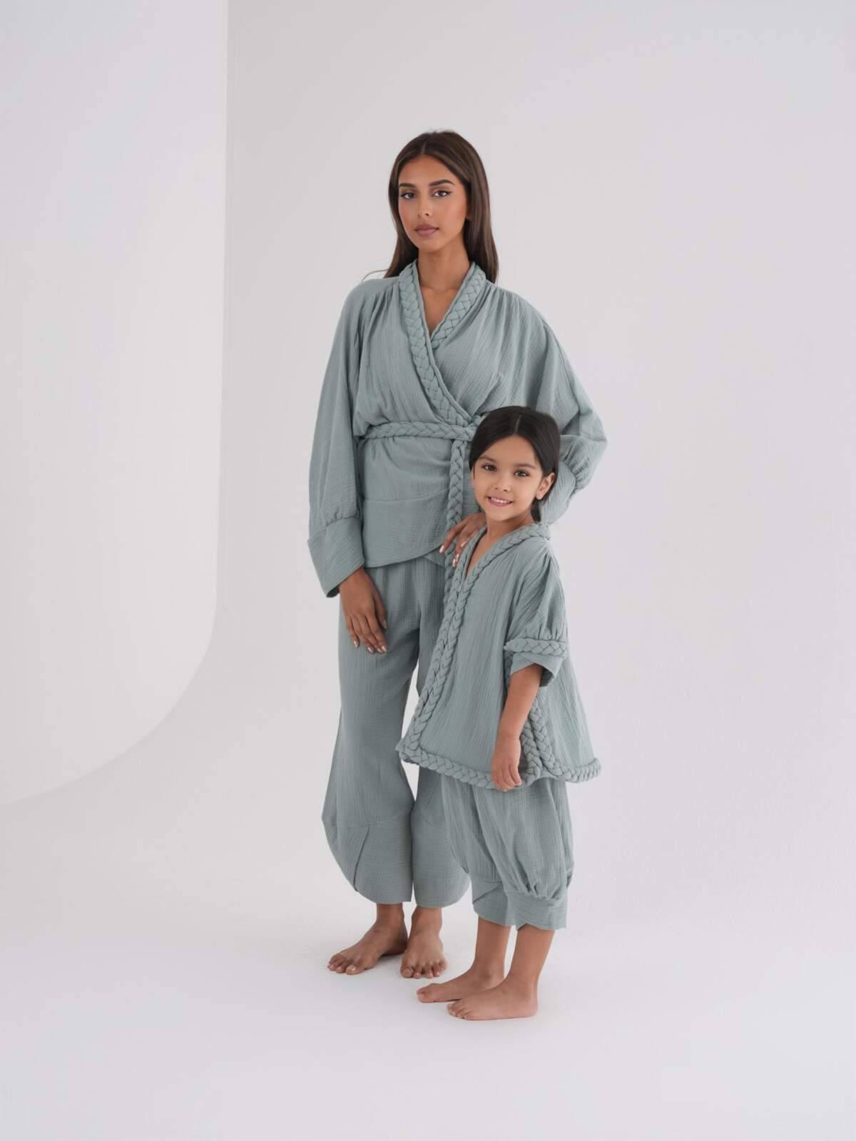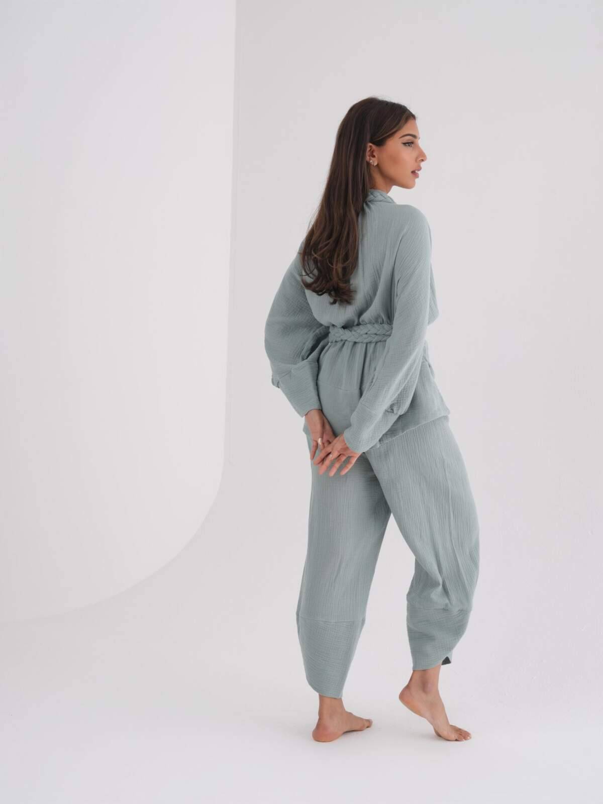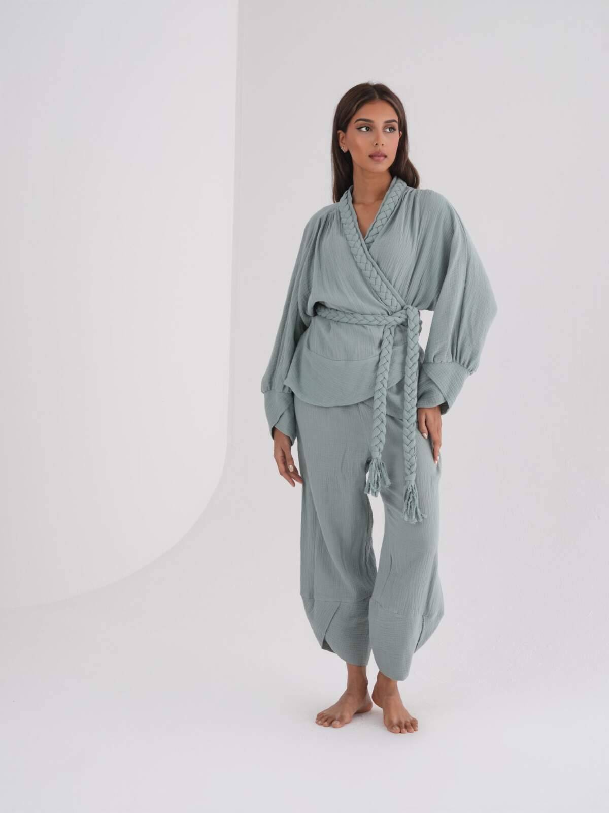 A suit: kimono top with hand-made braided detail that makes a belt, and loose pants. Sizes: S/M and L/XL