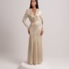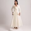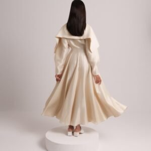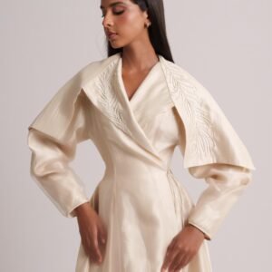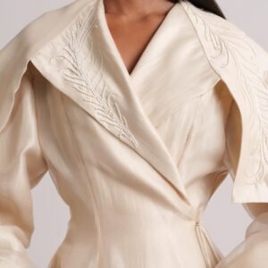 Sunkissed silk organza trench coat with an oversized collar, adorned with delicate hand embroidery.