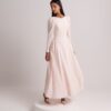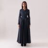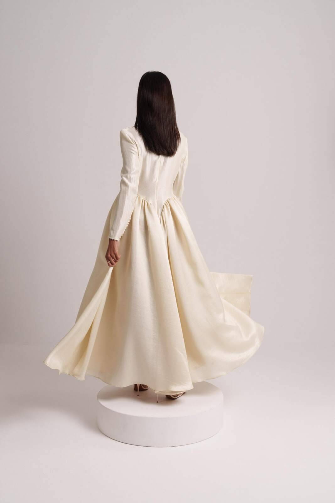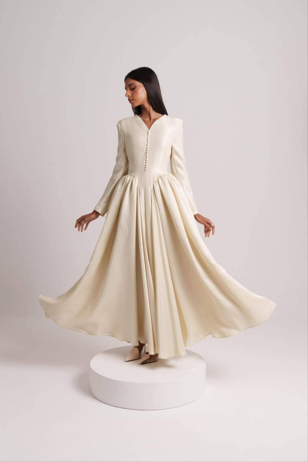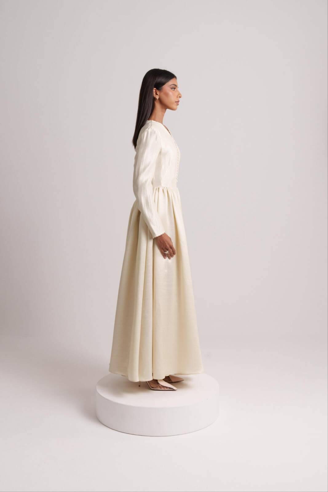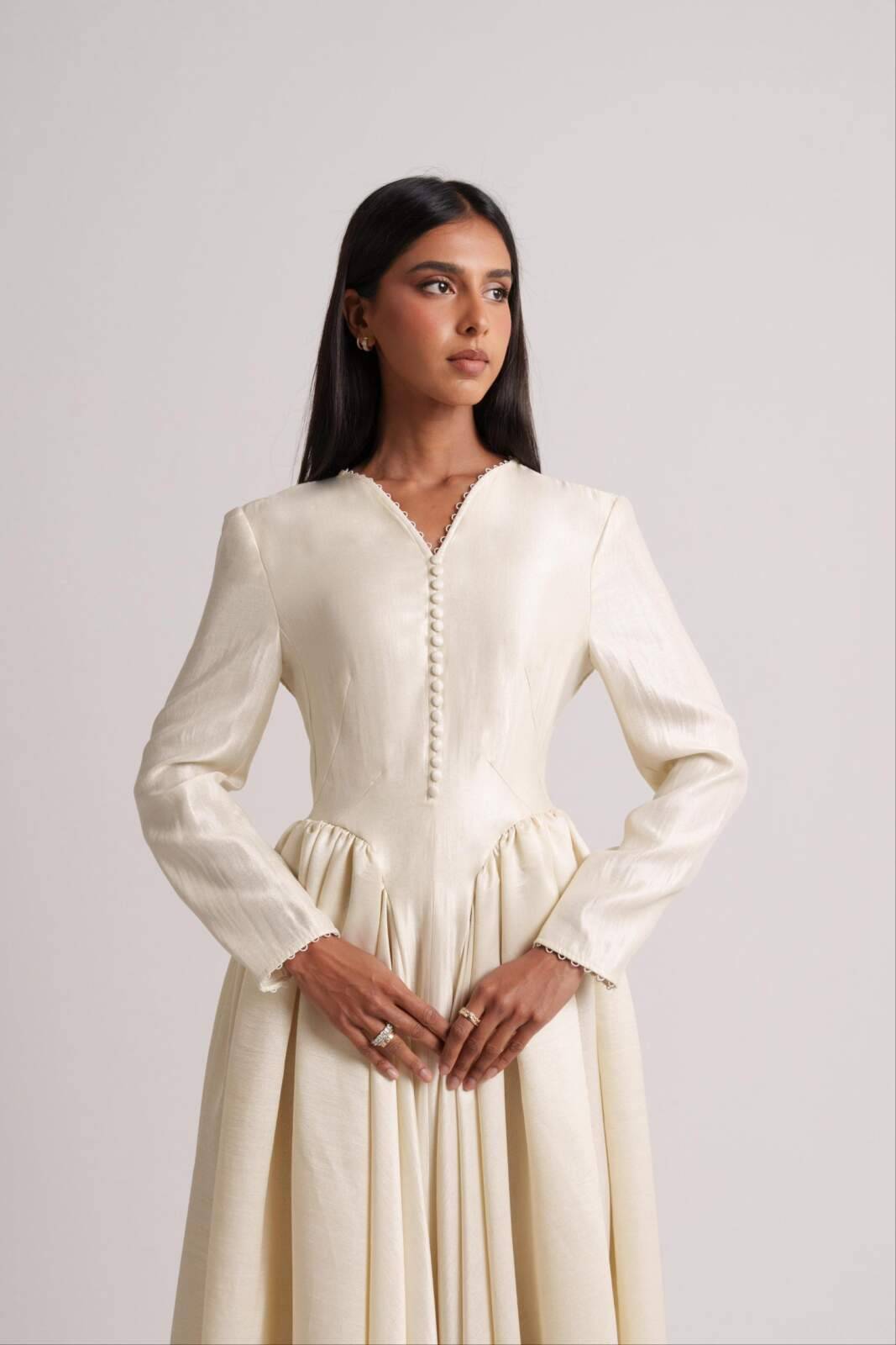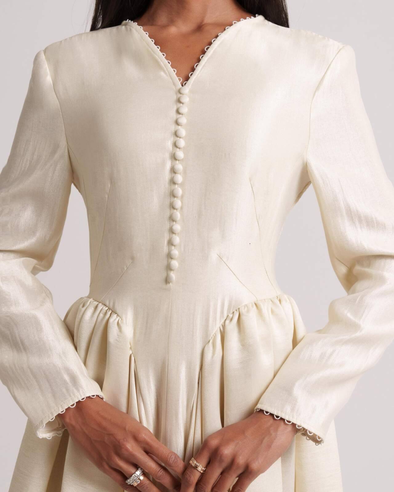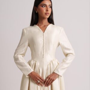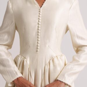 Sunlit-hued silk crepe dress featuring side pleats that flatter the figure and front buttons that define the silhouette. Sizes: XS to XL Lengths: 50, 52, 54, 56, 58