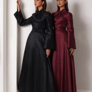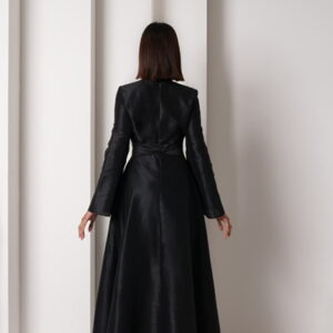 Twist detail black dress, made from shantung fabric, with a separate belt. Sizes: XS to XL