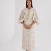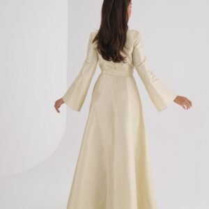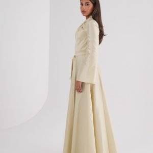 Twist detail golden beige dress, made from shantung fabric, with a separate belt. Sizes: XS to XL