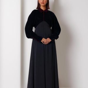 Black velvet dress with contrasting collar and buttons, high waisted and the deep center pleat makes it extra flowy. Sizes: XS to XL