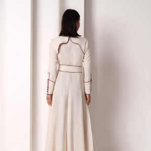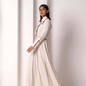 Western style inspired dress in beige linen blend with contrast piping and buttons. Sizes: XS to XL